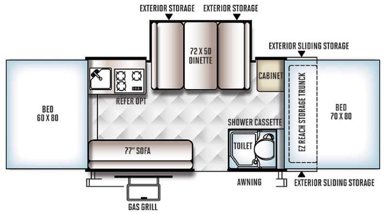 Outside you are sure to enjoy the gas grill, awning, and plenty of storage with the exterior trunk and exterior compartments.