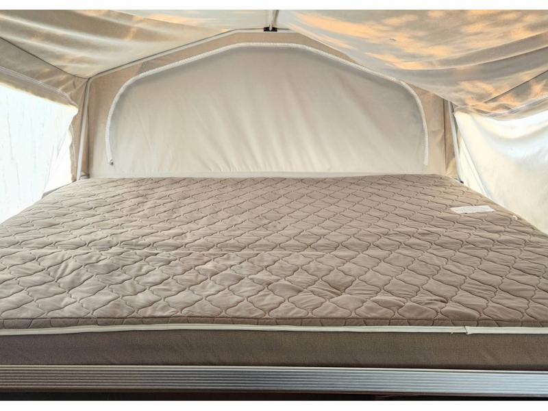 A cabinet is next to the front king tent bed. There is a queen 60" x 80" tent bed in the rear of the camper.