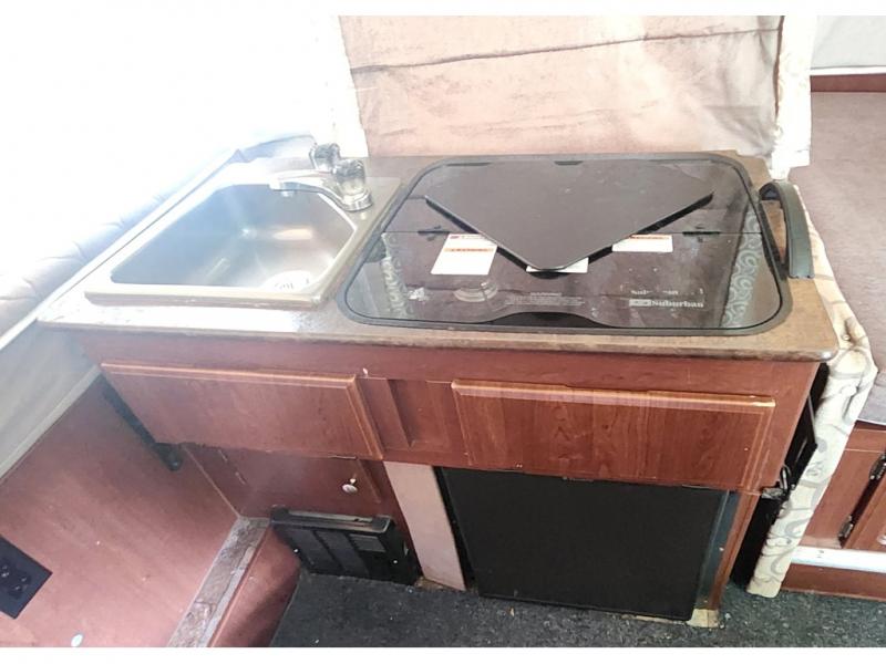 As you step inside to your left is a 77" sofa. This is a great place for visiting or taking a nap as well as providing extra sleeping space. On the opposite side is a sink, three burner range, optional refrigerator, plus a booth dinette slide out.