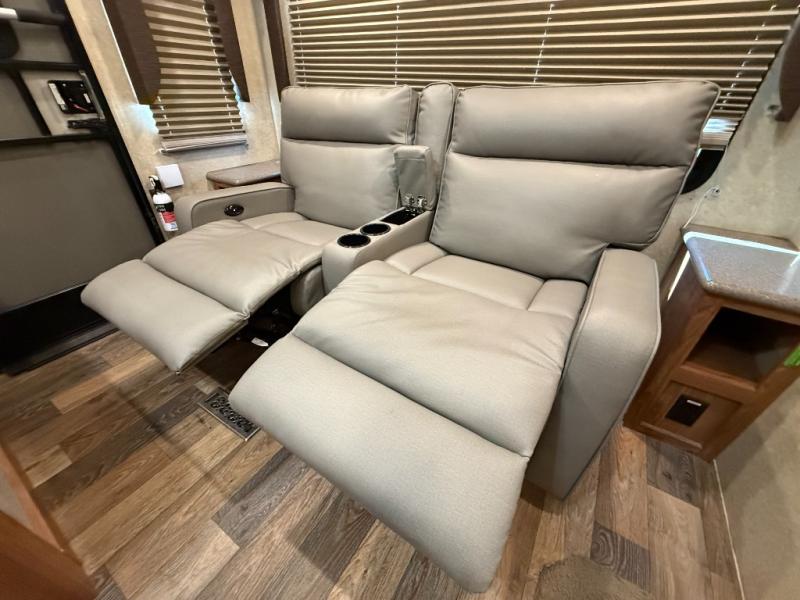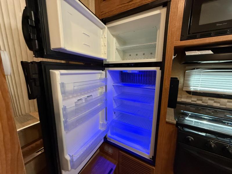 Living/Kitchen Area: Rear living space, center kitchen with 3-burner stove, microwave, mid-size refrigerator, and benches for dining