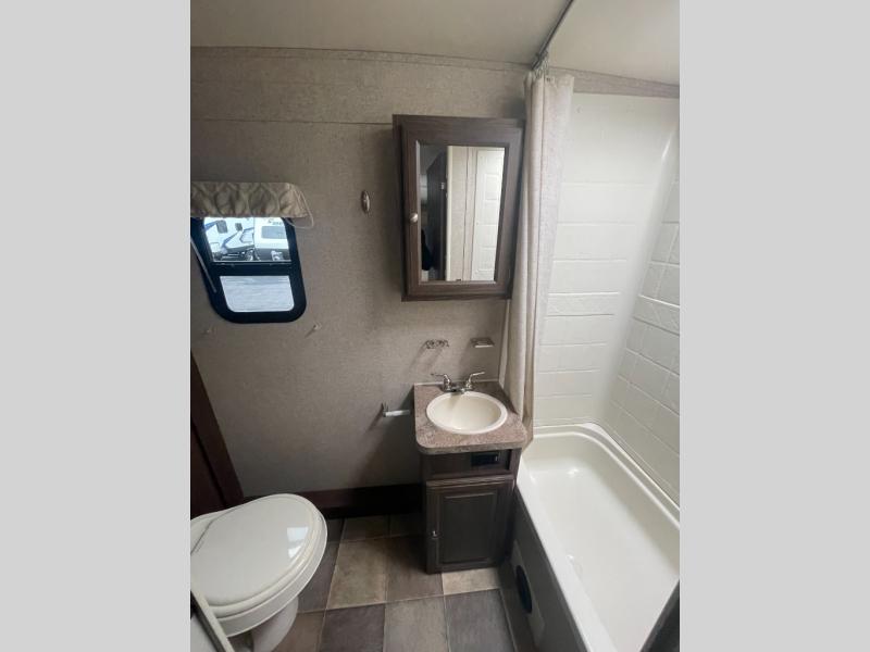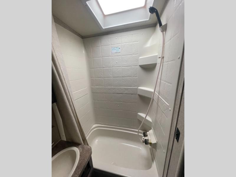 Located in the rear of the travel trailer is the bathroom. You will find a tub, sink, medicine cabinet, and linen cabinet.