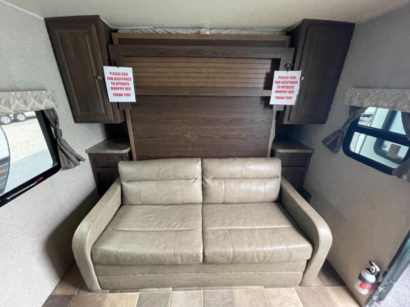This is an ideal travel trailer if you need a weekend away. Stepping inside the travel trailer to the right there is a sofa with a Murphy bed behind the sofa. There are wardrobes and nightstands on either side.