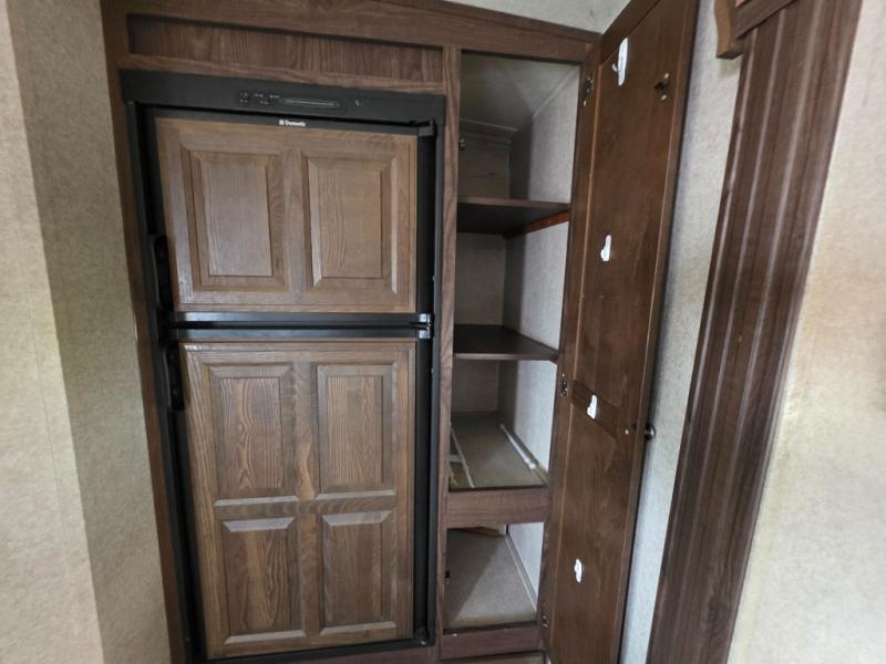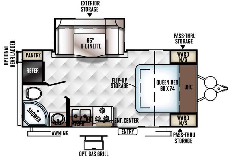 There are overhead cabinets and exterior storage throughout the trailer. You can even choose an optional gas grill and an optional rear ladder. Also outside there is a large pass thru storage area for all of your exterior camping gear, and more!
