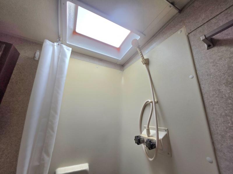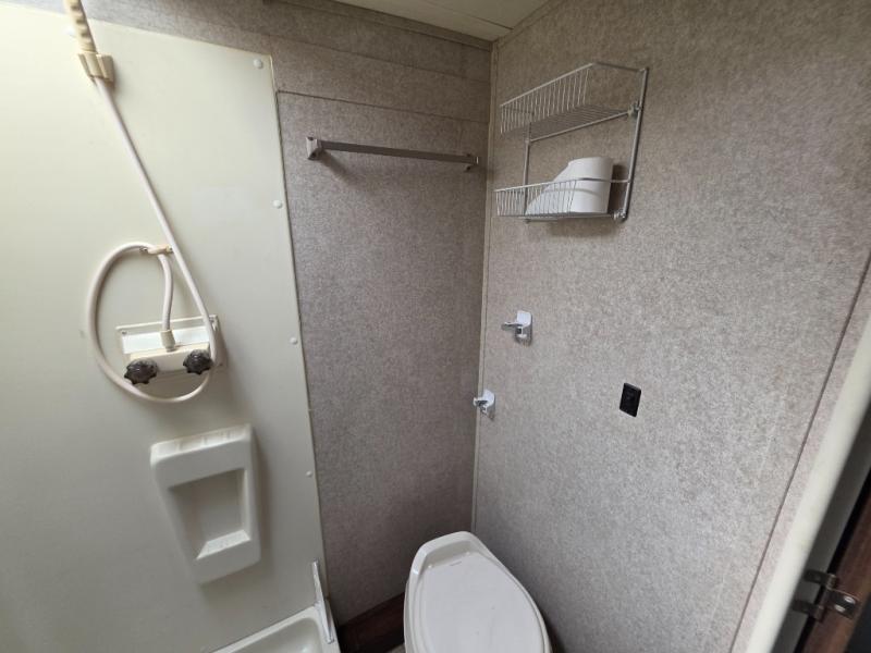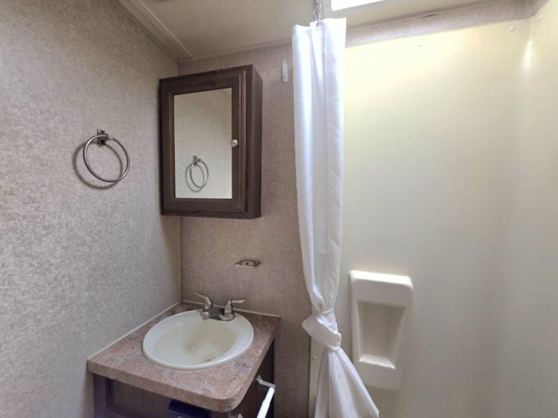 In the rear, is the bathroom. There is a toilet, shower, sink, and medicine cabinet.