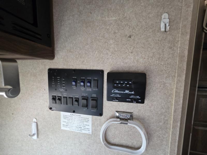 The u-dinette is on a slide. Along the rear wall you will find a pantry and a refrigerator. One side of the trailer offers a double kitchen sink, microwave, and three burner range. Above the range find an entertainment center.