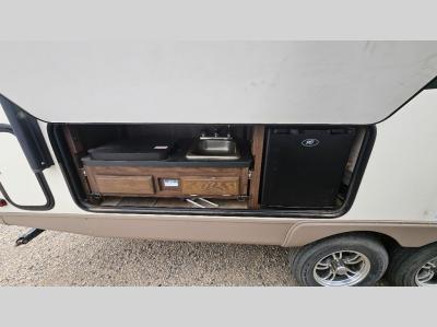 Outside fix a quick snack or dinner at the pull-out kitchen which features a two burner range, sink, and refrigerator. You will also find an optional gas grill, and an optional rear ladder. Your exterior camping gear can be stored in the exterior storage area and more!