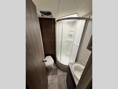Step inside and find a refrigerator to the left, and on the wall outside of the bathroom there is an entertainment center which can easily be seen from the kitchen area. to the right of the entry door find a three burner range, microwave, double kitchen sink, large counter area with overhead cabinets, and a pantry. The u-dinette is on a slide and there is an overhead cabinet.