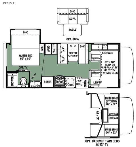 Above the cab you will find a 60" x 80" bunk, or you can choose optional cabinets with 42" TV or 32" TV with twin beds, and more!