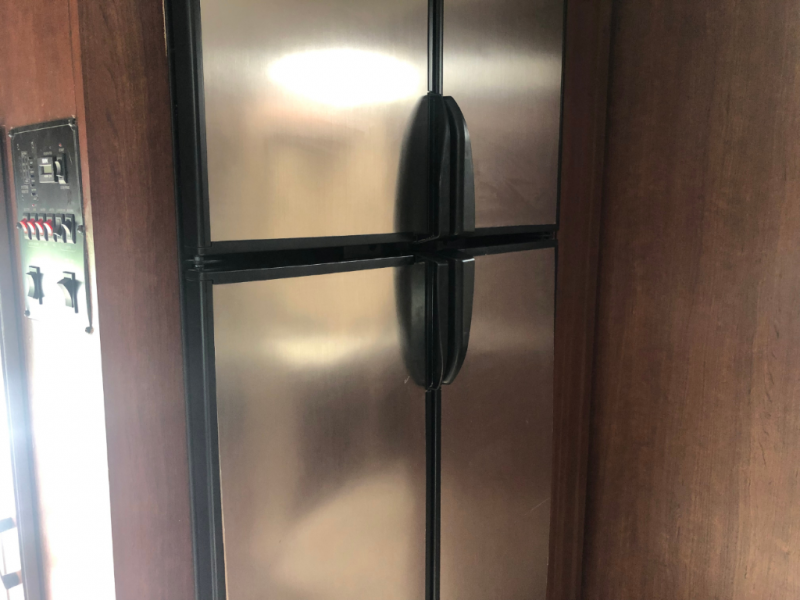 The living and kitchen areas feature a sofa with overhead cabinets, a two door refrigerator or you can choose an optional four door refrigerator, and a pantry along one wall. The opposite side boasts an L-shaped kitchen counter with three burner range, overhead microwave and cabinets, and a flip down countertop extension. There is also a dinette with overhead cabinets.