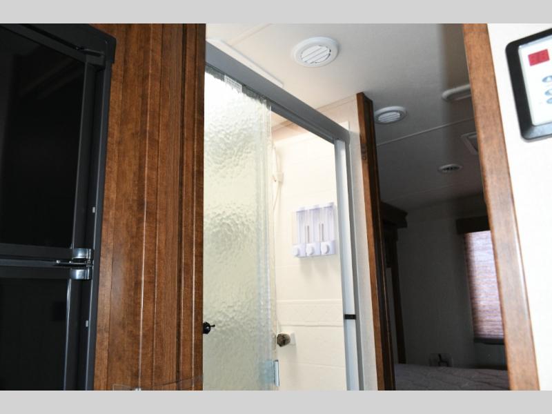 Walk-thru bathroom with shower on one side and private toilet/vanity on the other, with sliding doors for full privacy.