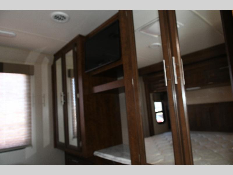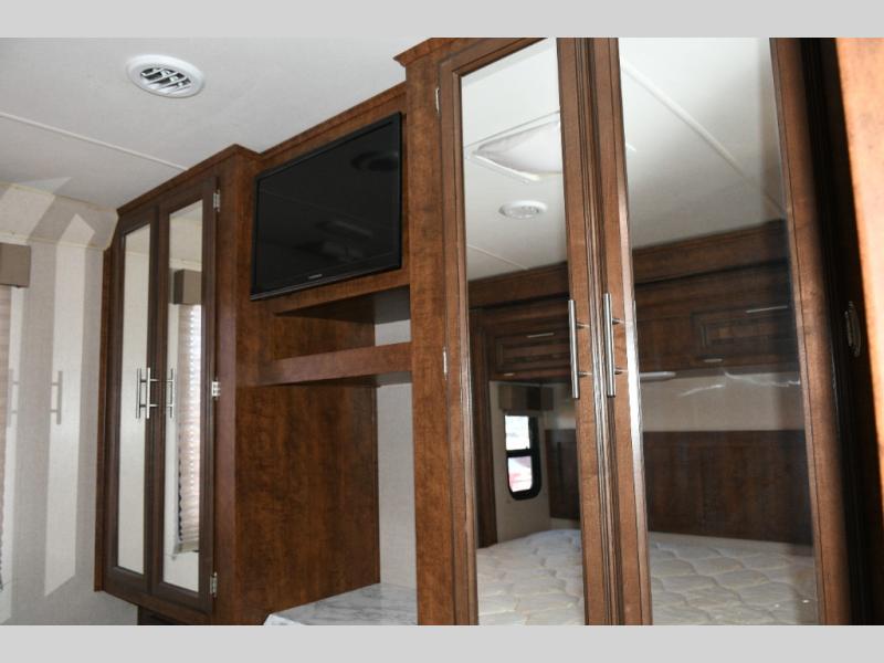King bed slide-out in the rear bedroom, complete with wardrobes, overhead storage, and LED TV.