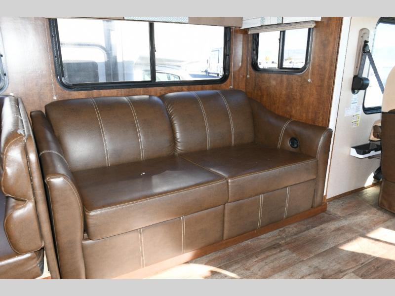 Versatile Seating – Hide-a-bed sofa with footrests and a wrap-around booth dinette for lounging, dining, or converting into extra sleeping space.