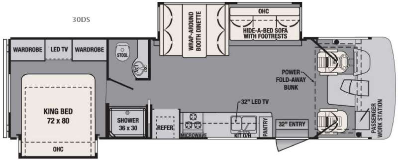 Power fold-away bunk offers extra sleeping without sacrificing daytime space.