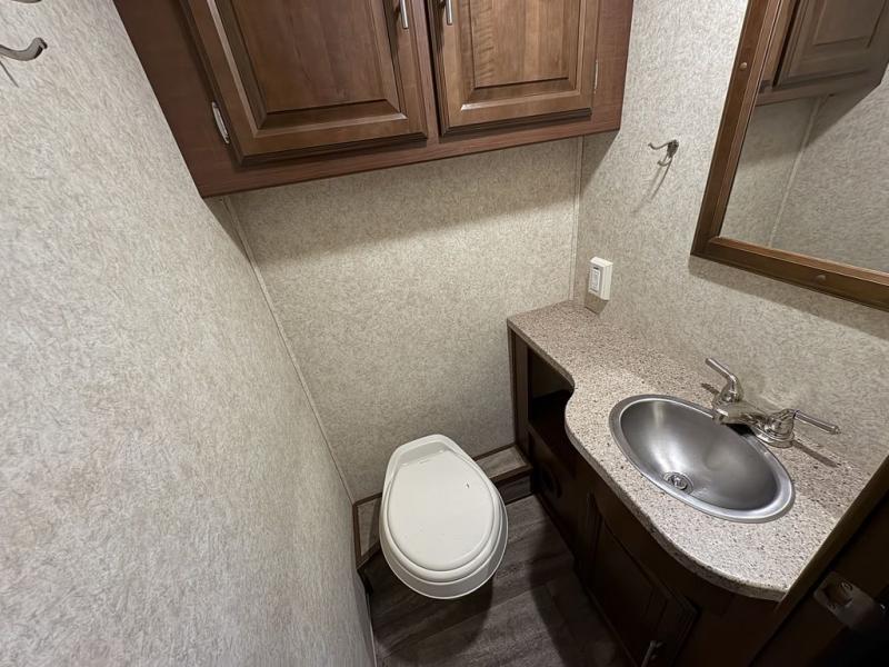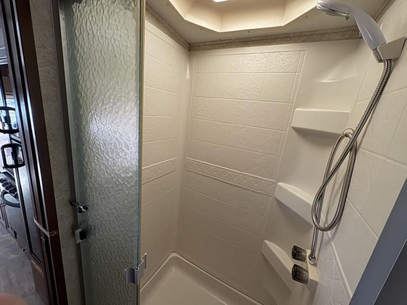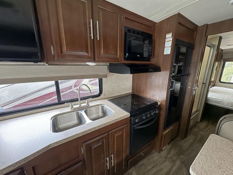 As you enter the Georgetown 310DS you will find that the main living area has a sofa to the right of the entrance. On the opposite side of the motor home there is a slide with a dinette, TV lift, three burner range, and microwave. Adjacent to the slide you will find a double kitchen sink. Across from the sink there is a nice size refrigerator and a pantry.