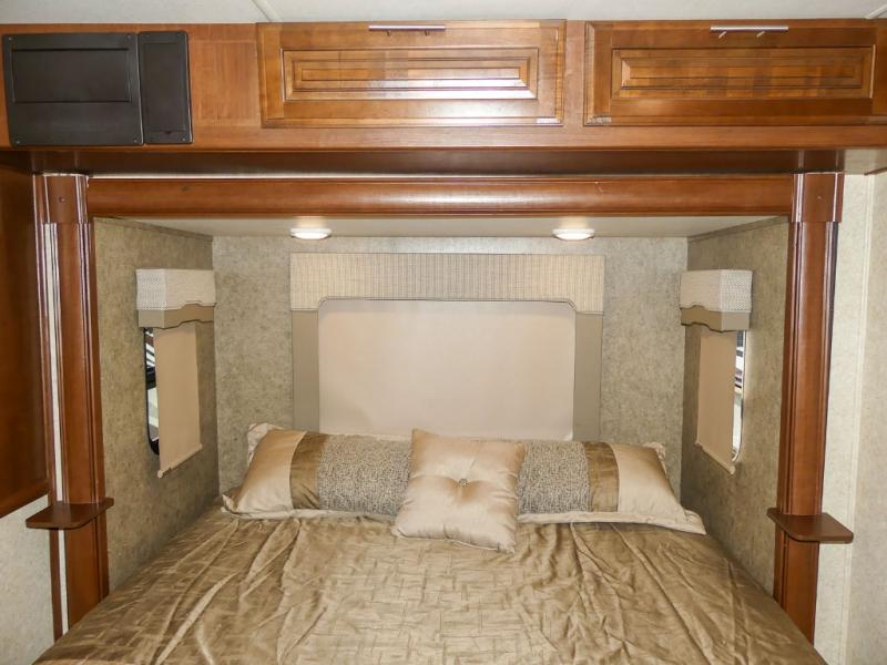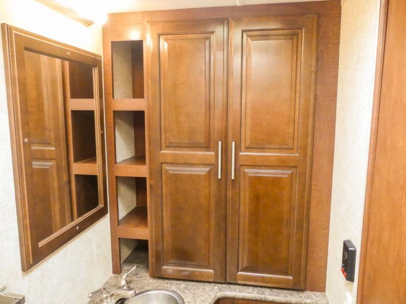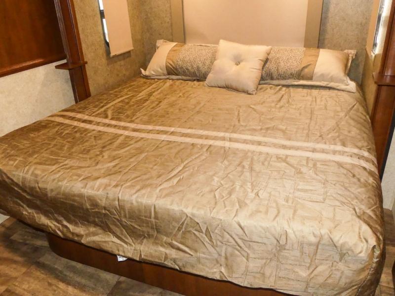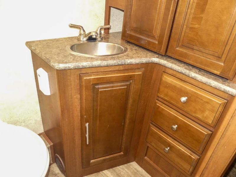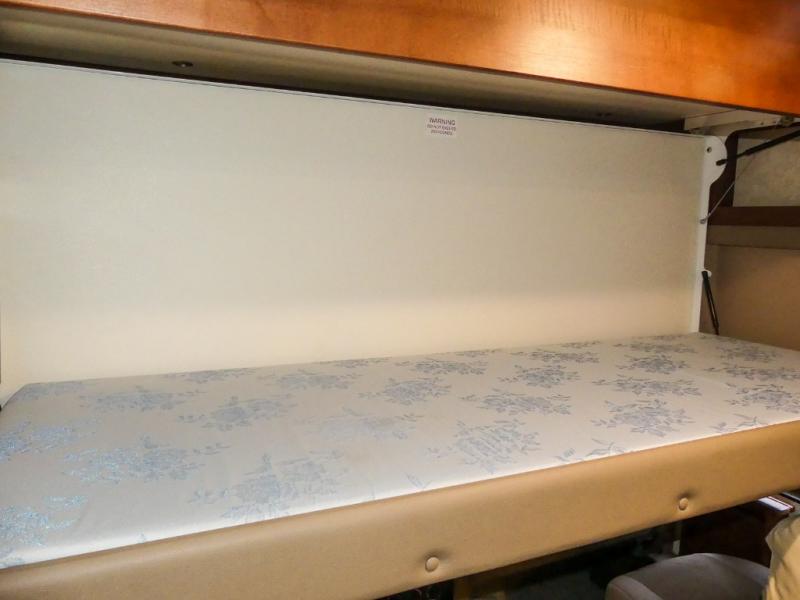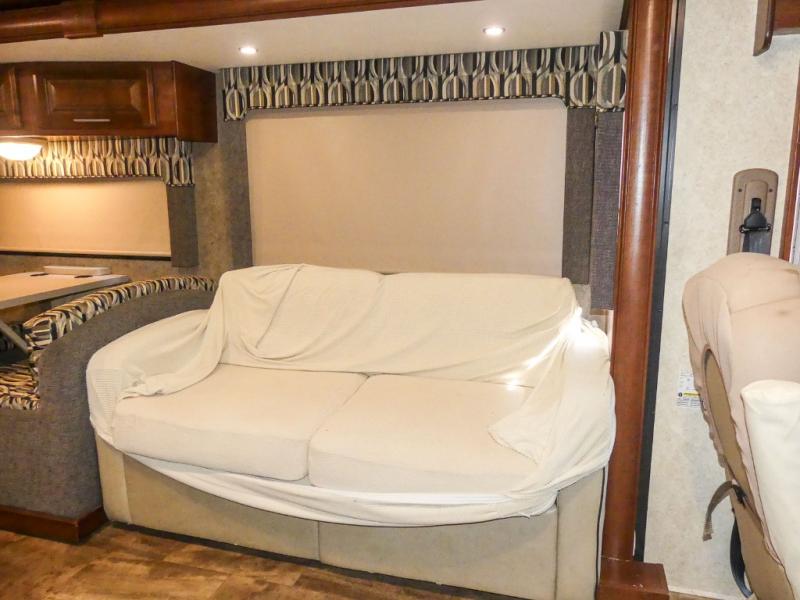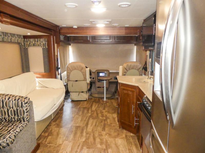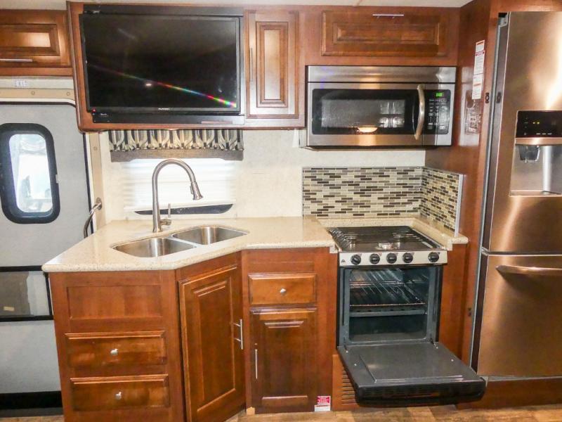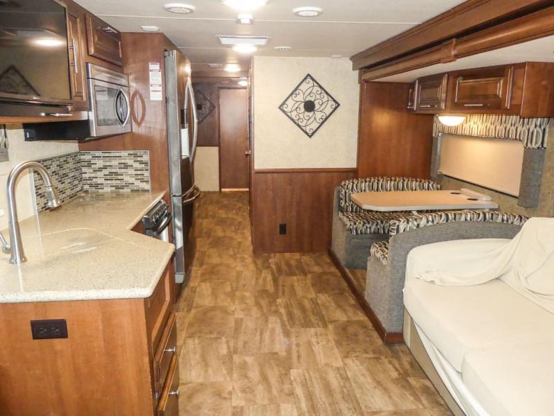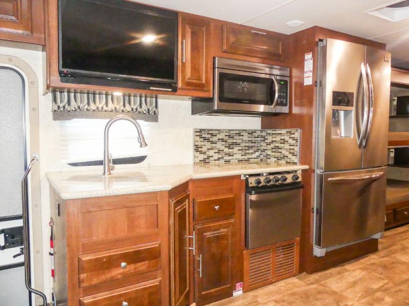 You will be wowed by the space and beauty inside the motor home. In the kitchen/living area there is a slide with a hide-a-bed sofa, dinette, and overhead cabinet. On the opposite side of the motor home you will see a double kitchen sink, overhead TV, three burner range, microwave, refrigerator and pantry.
