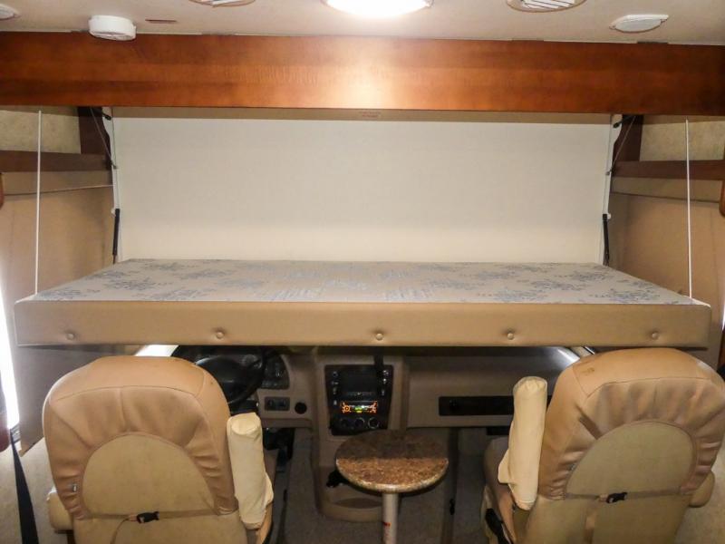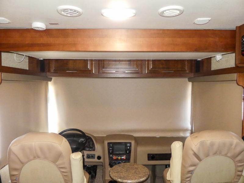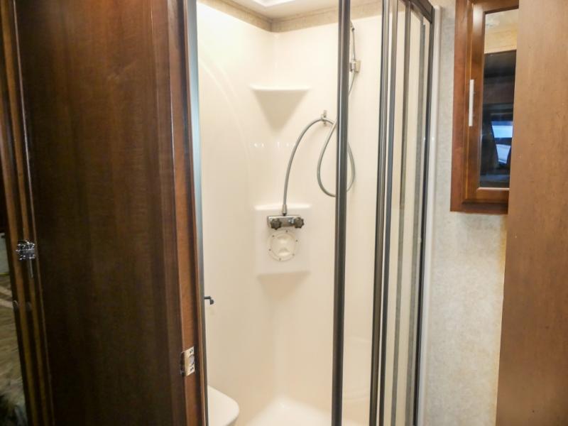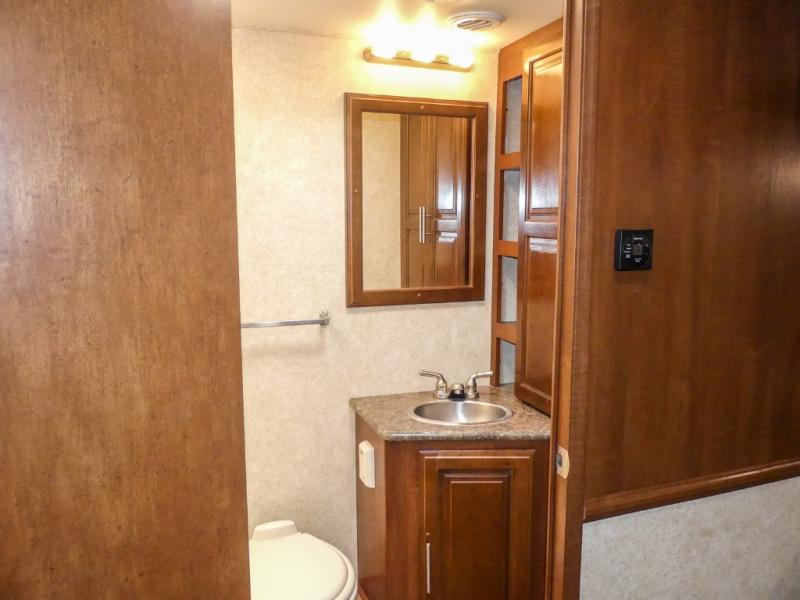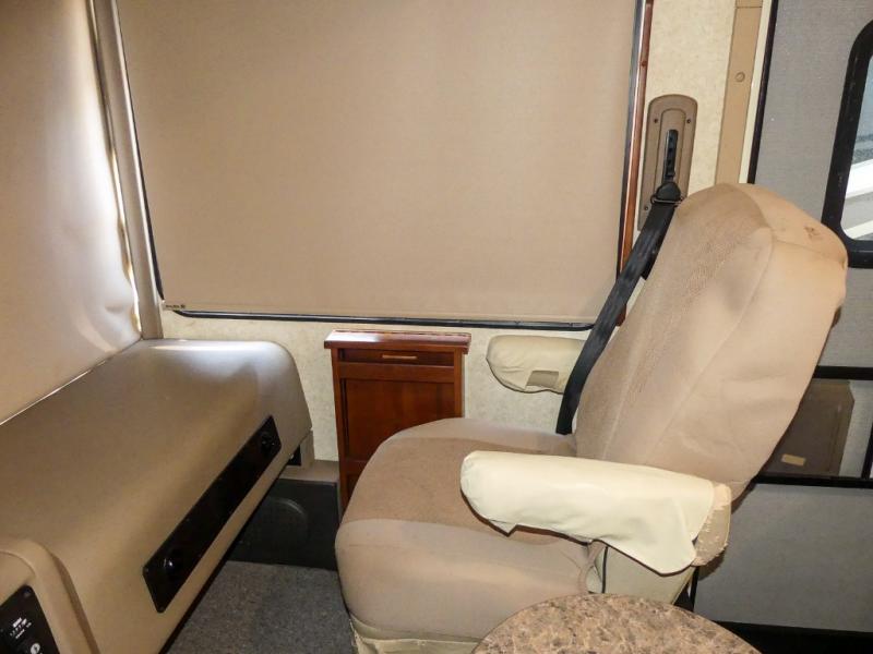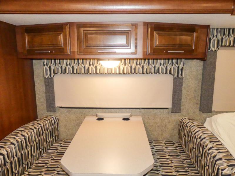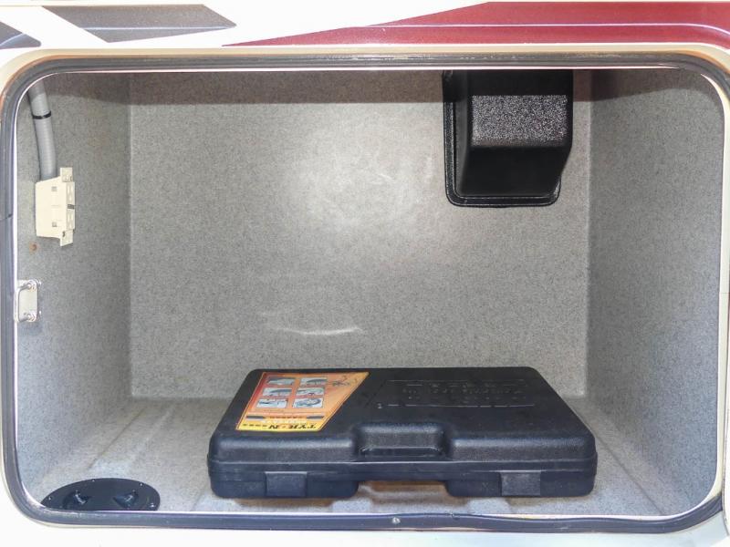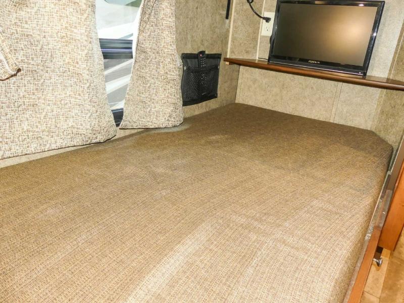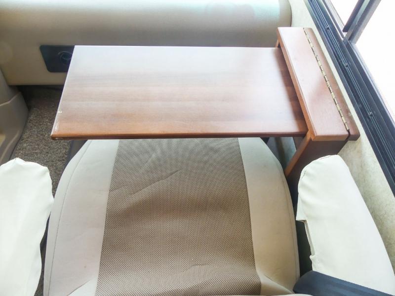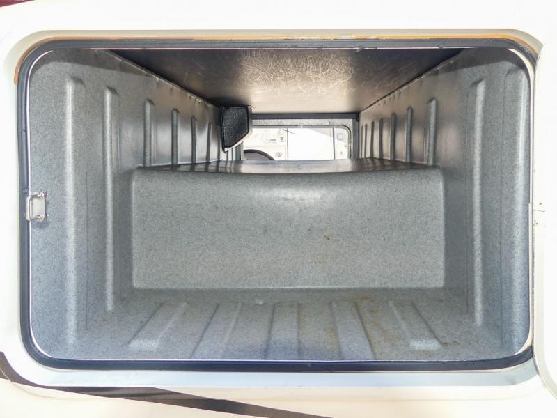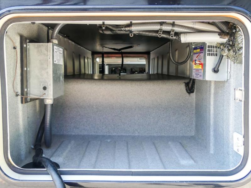 You will be wowed by the space and beauty inside the motor home. In the kitchen/living area there is a slide with a hide-a-bed sofa, dinette, and overhead cabinet. On the opposite side of the motor home you will see a double kitchen sink, overhead TV, three burner range, microwave, refrigerator and pantry.