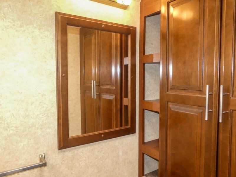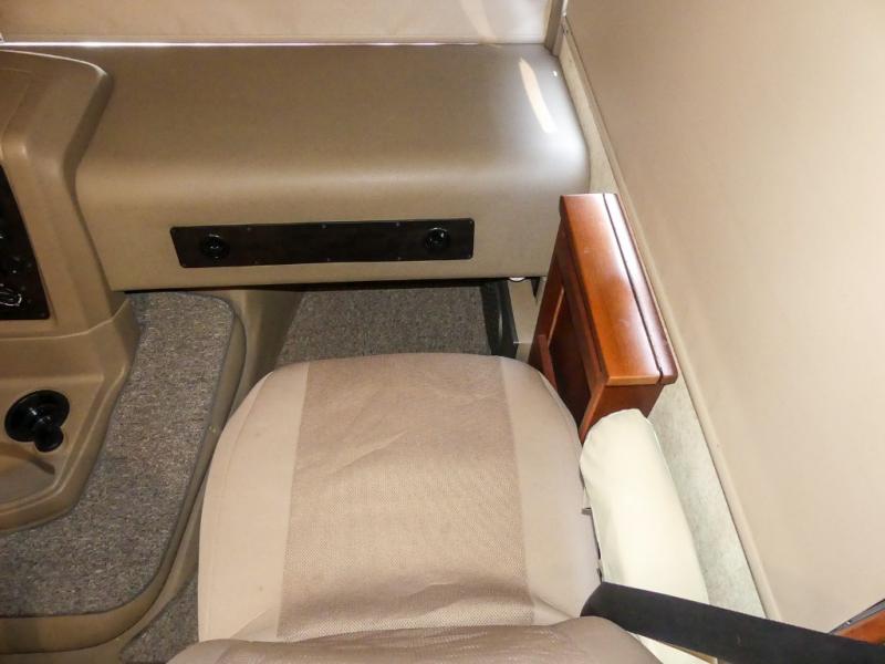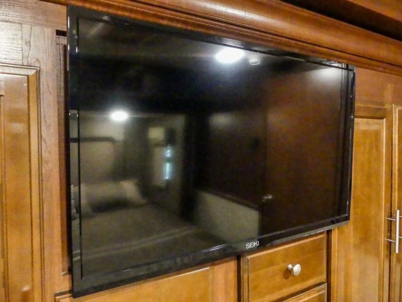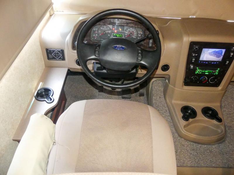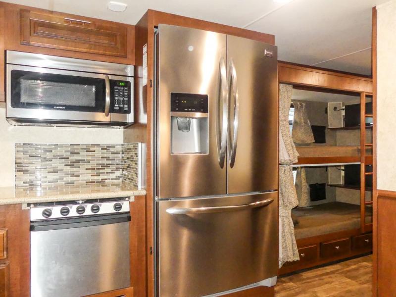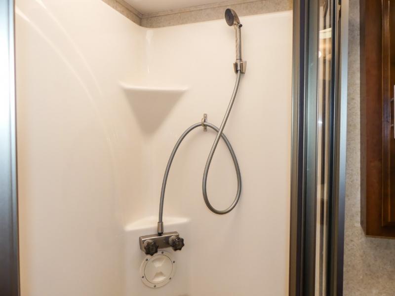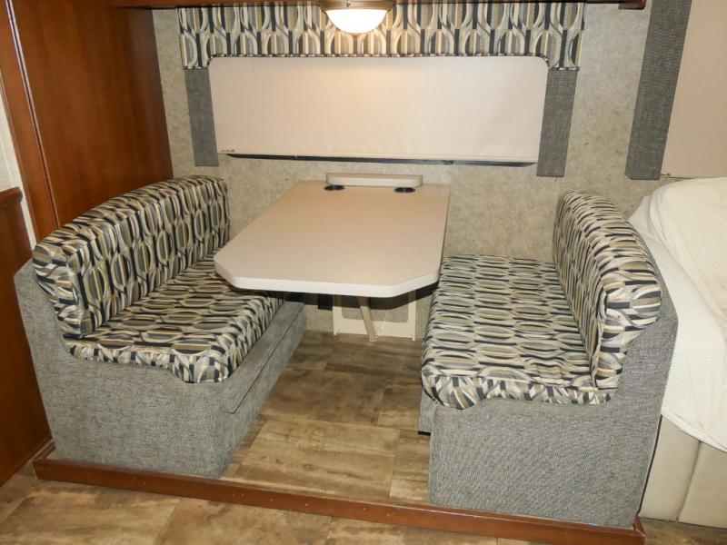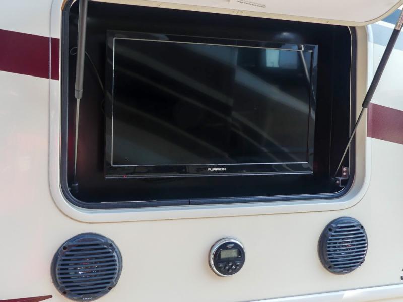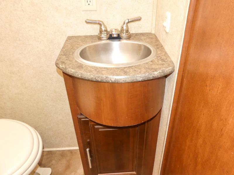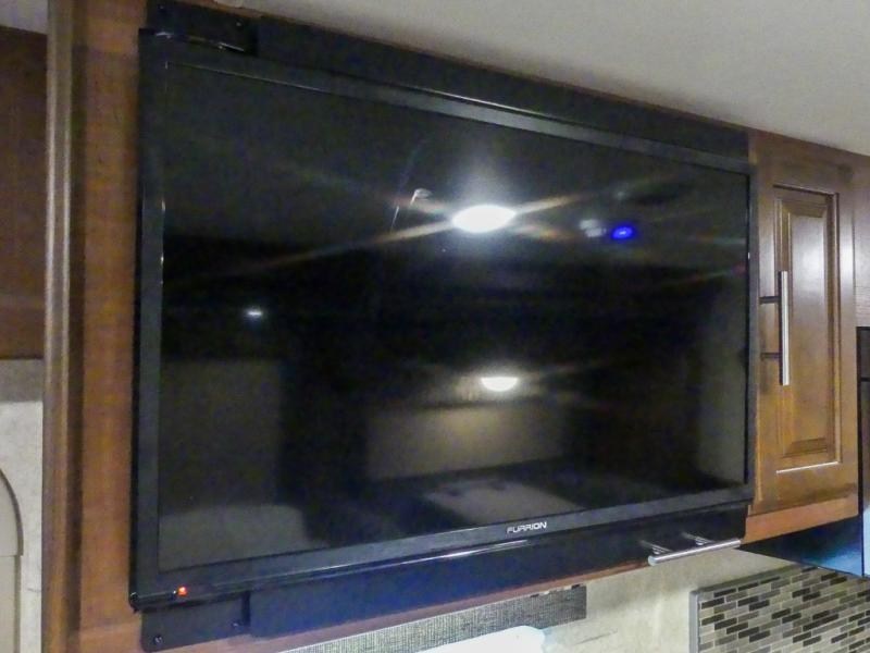 You will be wowed by the space and beauty inside the motor home. In the kitchen/living area there is a slide with a hide-a-bed sofa, dinette, and overhead cabinet. On the opposite side of the motor home you will see a double kitchen sink, overhead TV, three burner range, microwave, refrigerator and pantry.