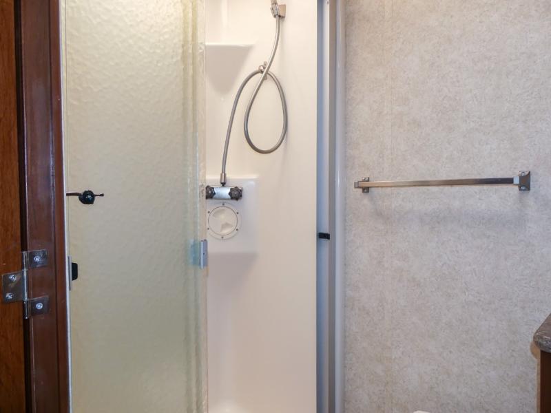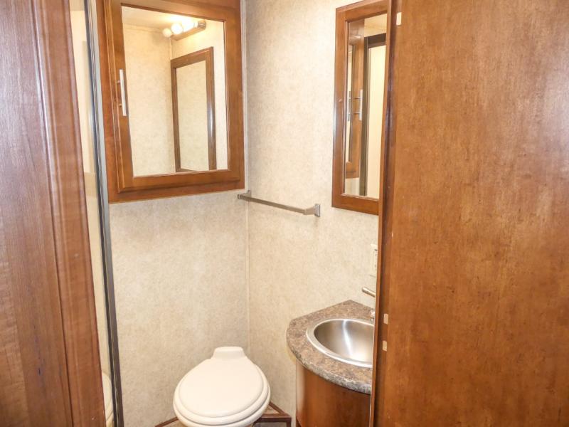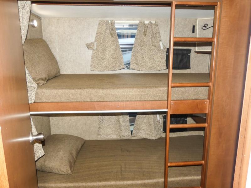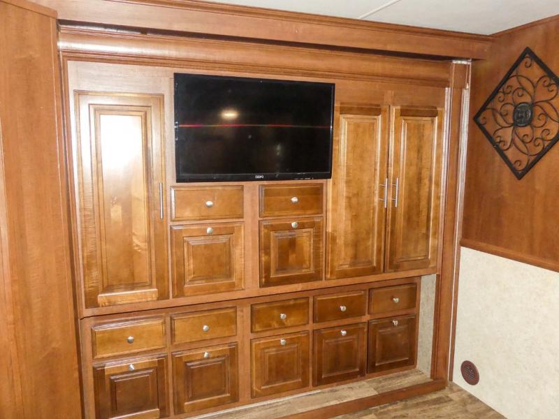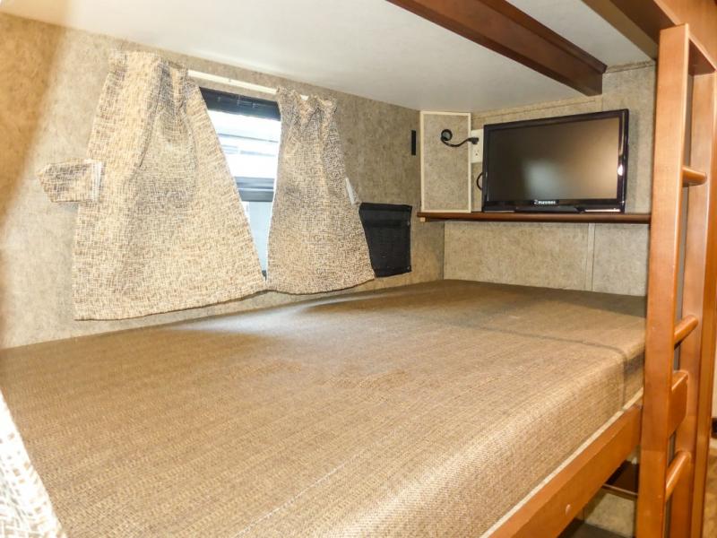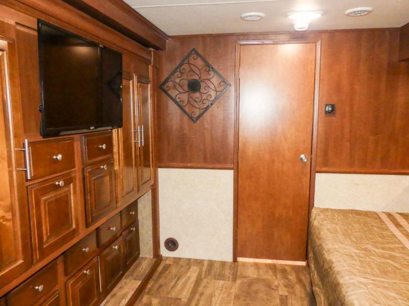 Across from the bathroom and leading in the bedroom there is a slide with a set of bunk beds, large wardrobe, and TV. Across from the wardrobe you will find a slide with a king bed. Along the rear of the room there is a master bath with a shower, toilet, sink, washer/dryer, and more!