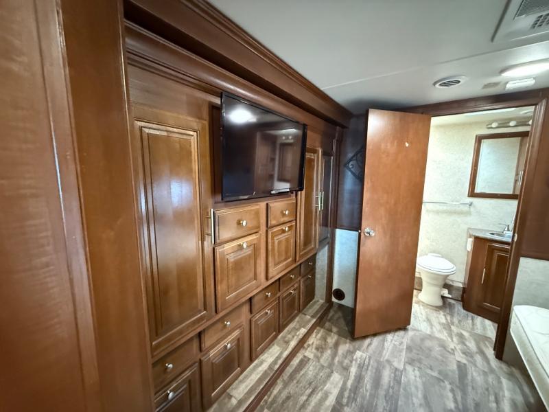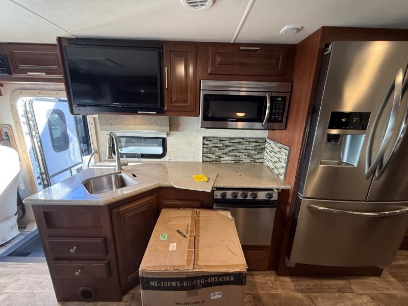 You will be wowed by the space and beauty inside the motor home. In the kitchen/living area there is a slide with a hide-a-bed sofa, dinette, and overhead cabinet. On the opposite side of the motor home you will see a double kitchen sink, overhead TV, three burner range, microwave, refrigerator or you can choose an optional residential refrigerator, and pantry.