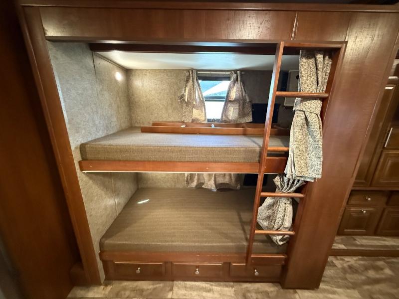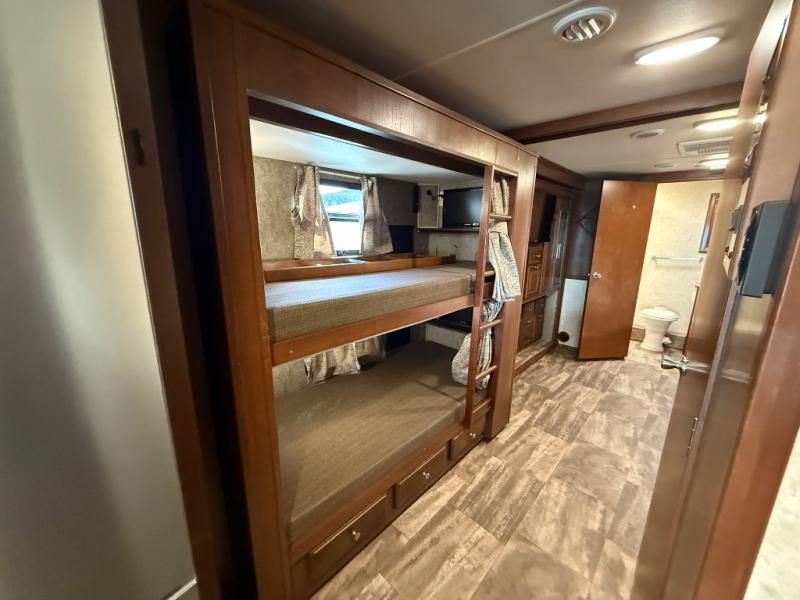 Across from the bathroom and leading in the bedroom there is a slide with a set of bunk beds, large wardrobe, and TV. Across from the wardrobe you will find a slide with a king bed. Along the rear of the room there is a master bath with a shower, toilet, sink, washer/dryer, and more!