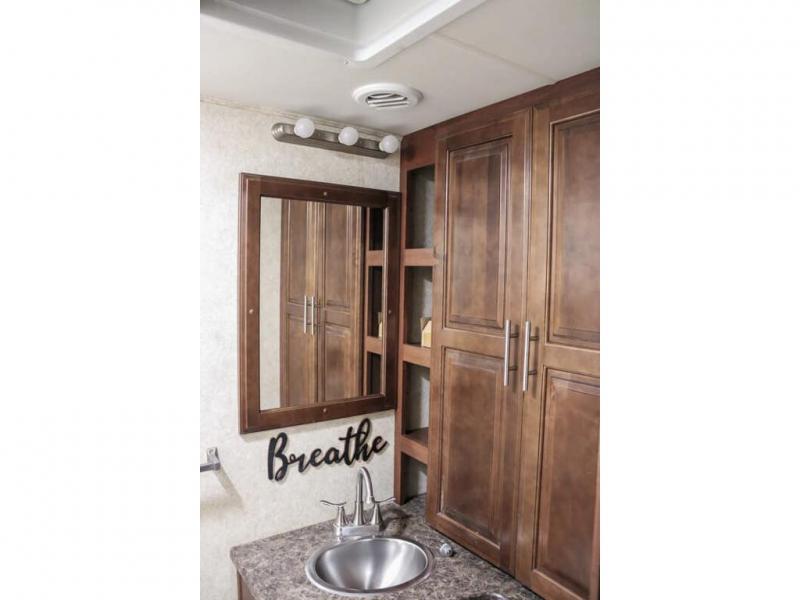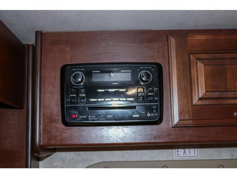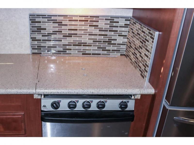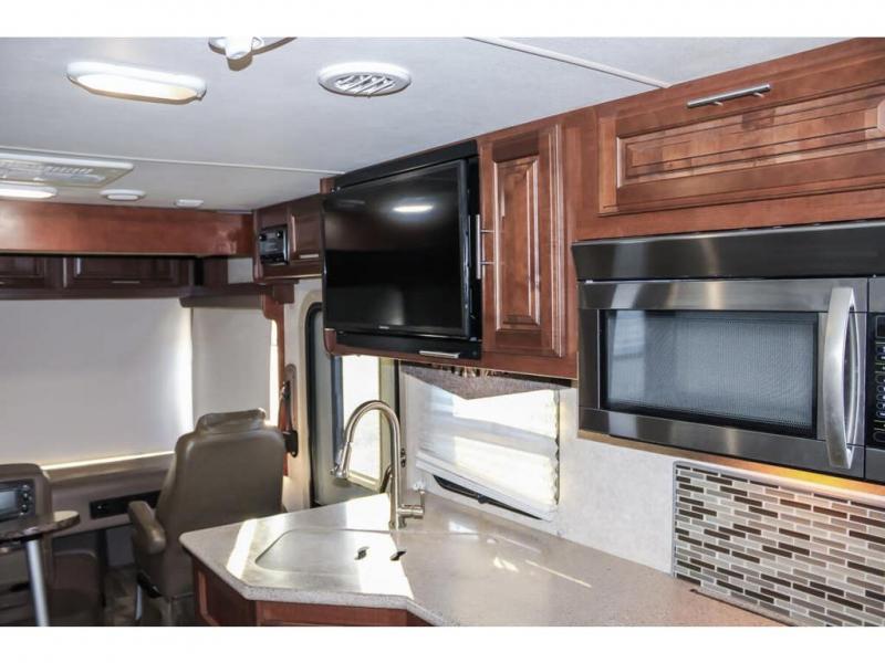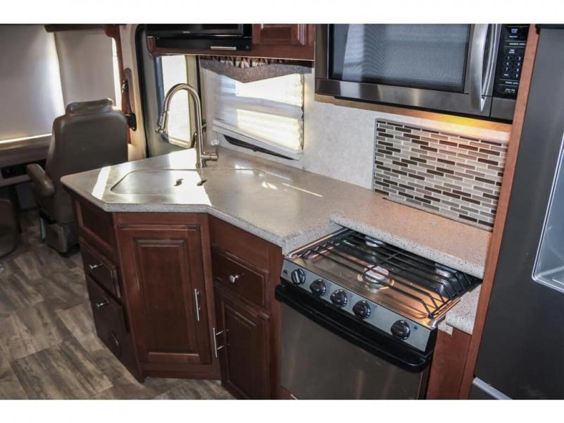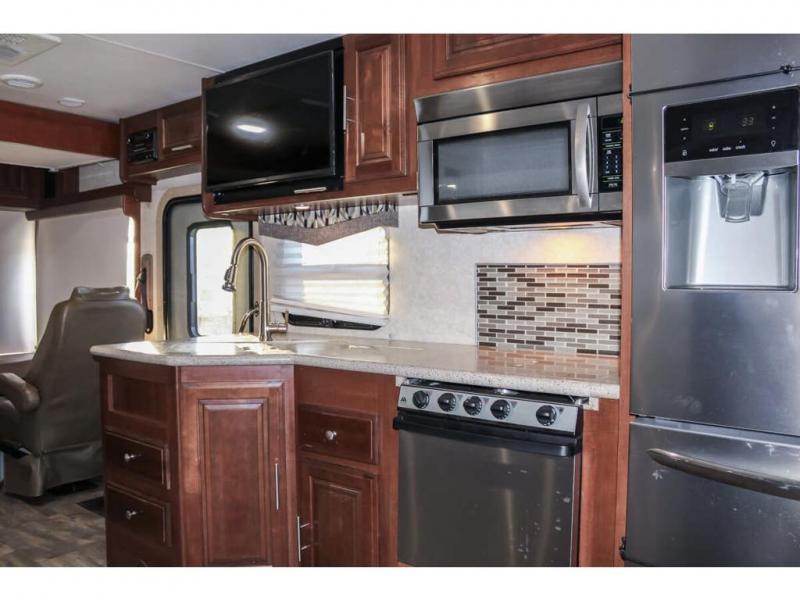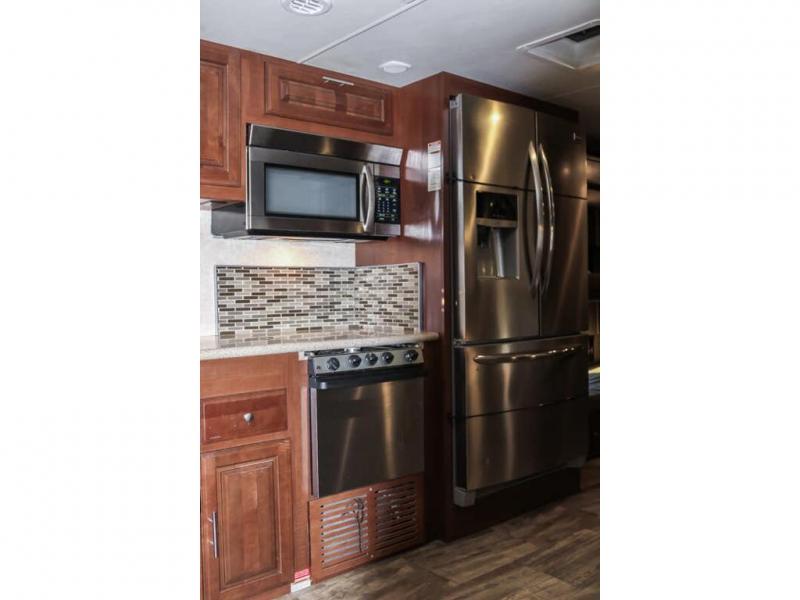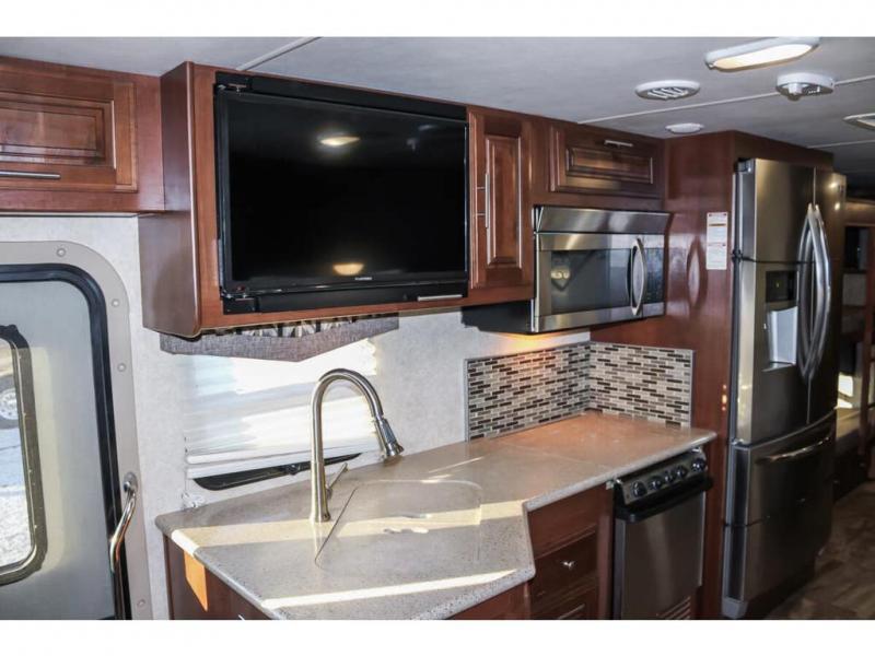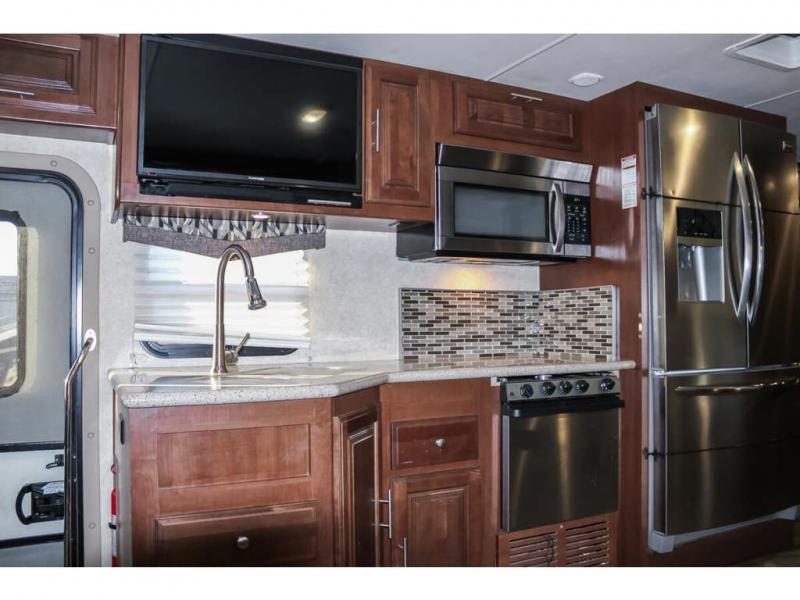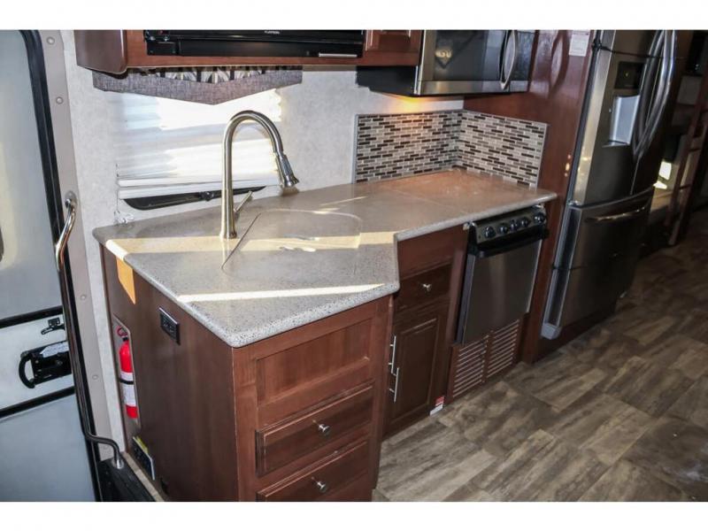 You will be wowed by the space and beauty inside the motor home. In the kitchen/living area there is a slide with a hide-a-bed sofa, dinette, and overhead cabinet. On the opposite side of the motor home you will see a double kitchen sink, overhead TV, three burner range, microwave, refrigerator or you can choose an optional residential refrigerator, and pantry.