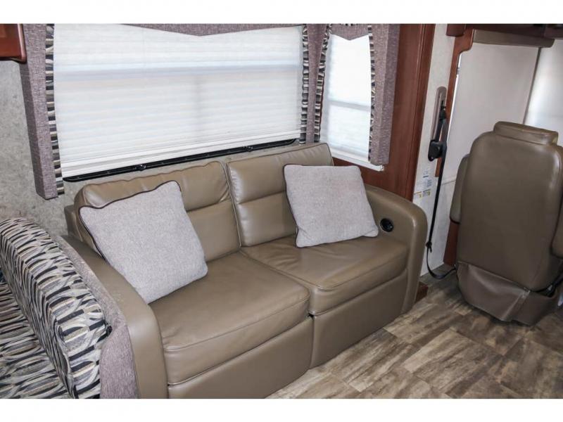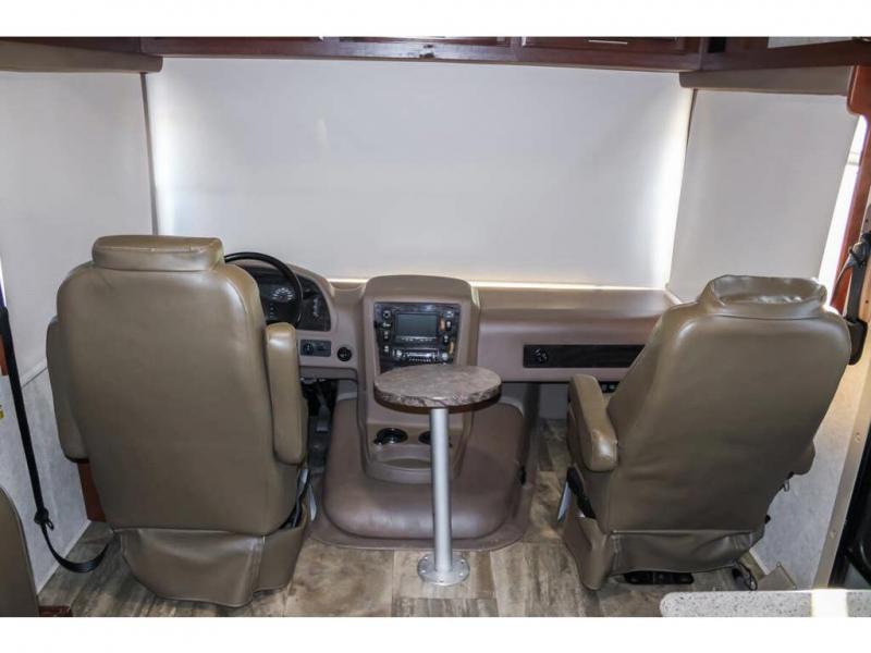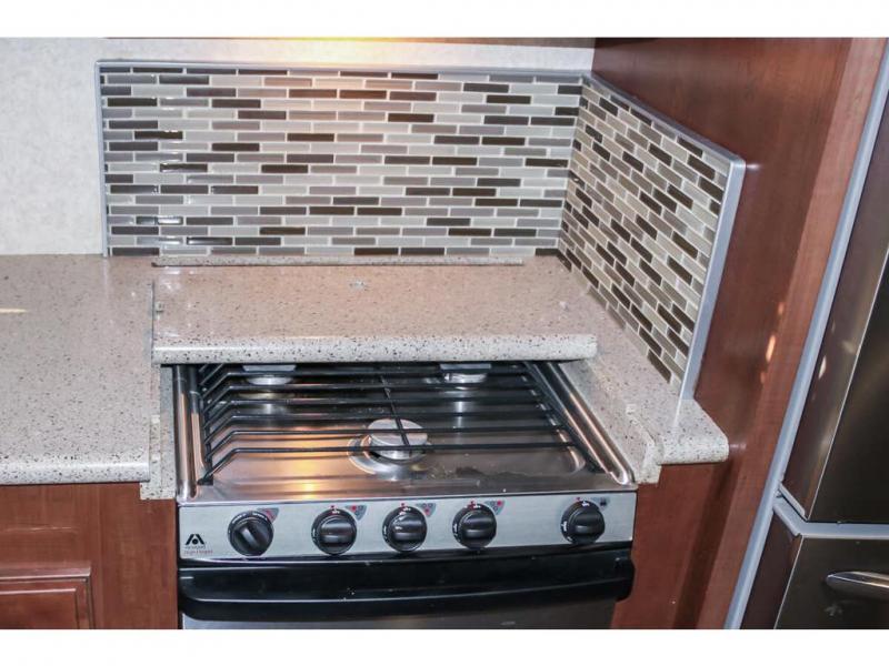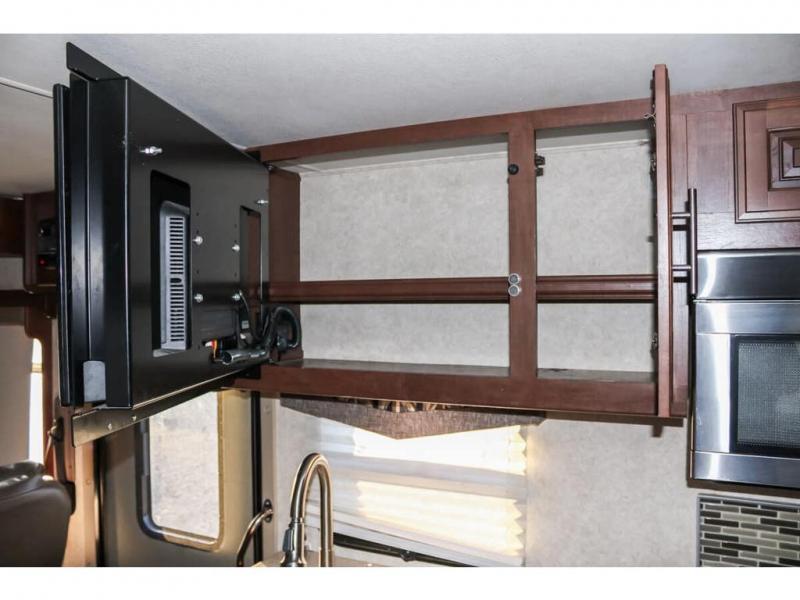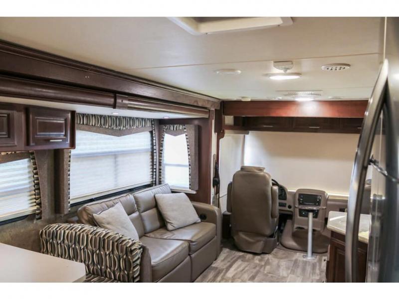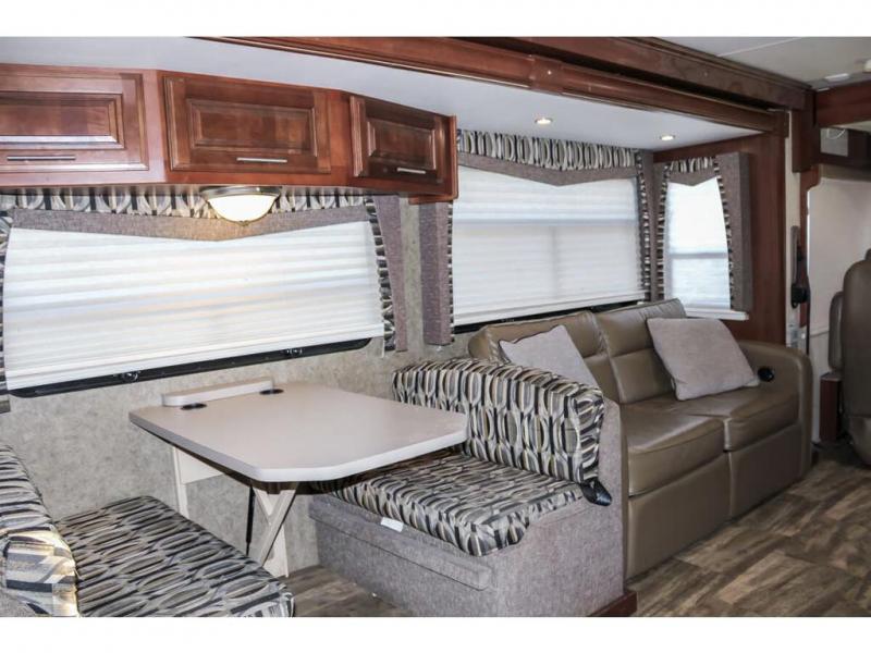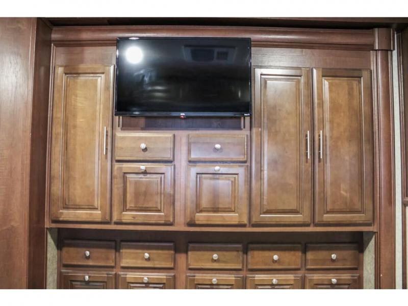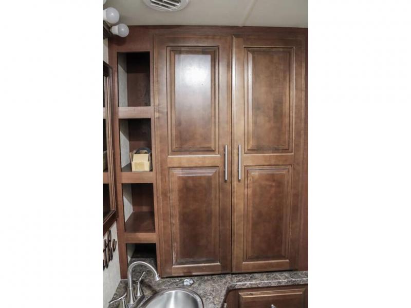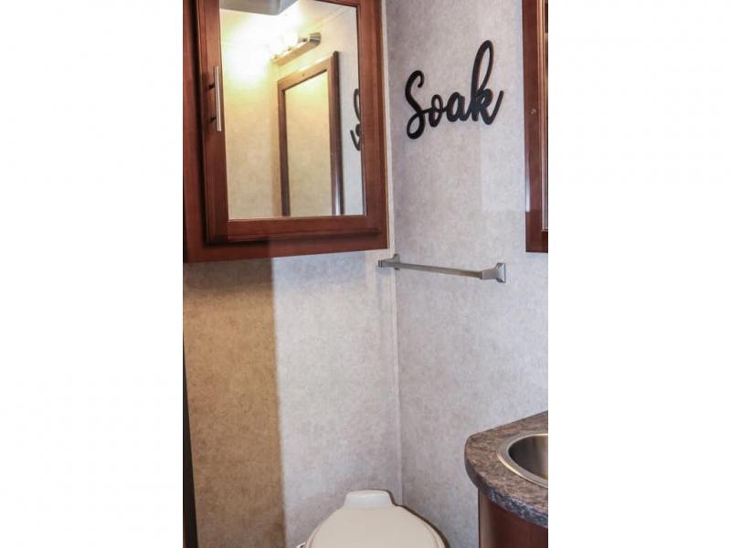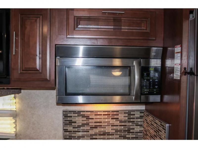 You will be wowed by the space and beauty inside the motor home. In the kitchen/living area there is a slide with a hide-a-bed sofa, dinette, and overhead cabinet. On the opposite side of the motor home you will see a double kitchen sink, overhead TV, three burner range, microwave, refrigerator or you can choose an optional residential refrigerator, and pantry.