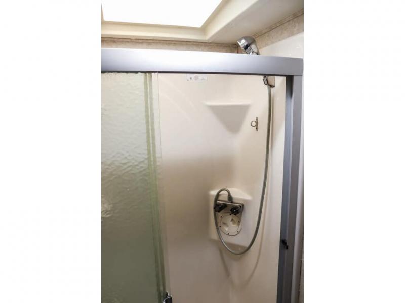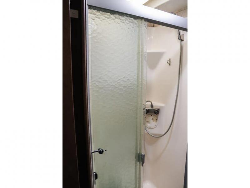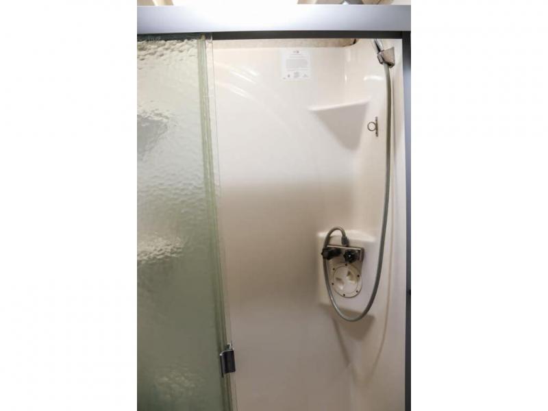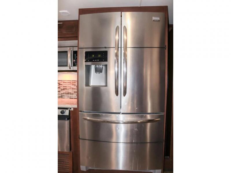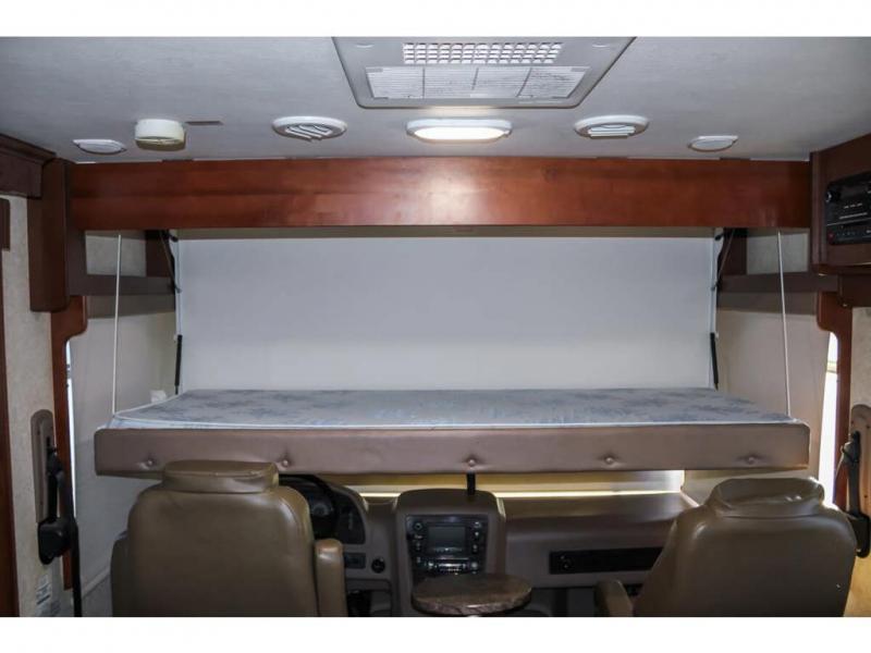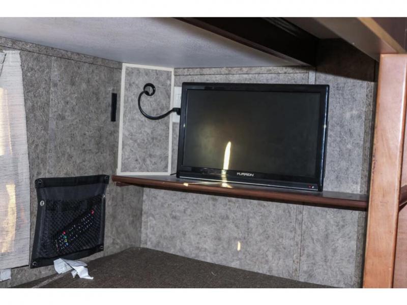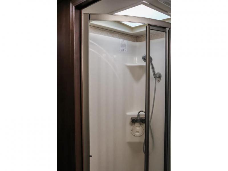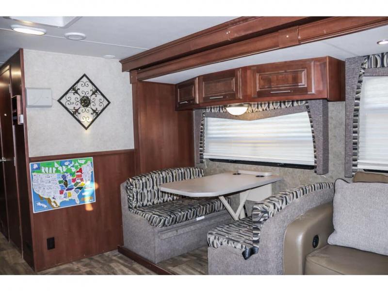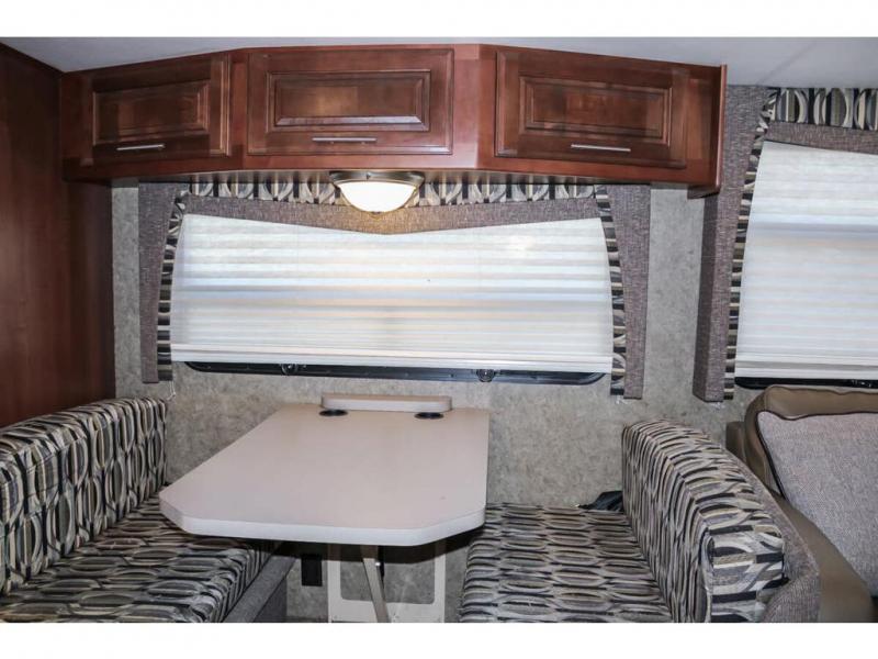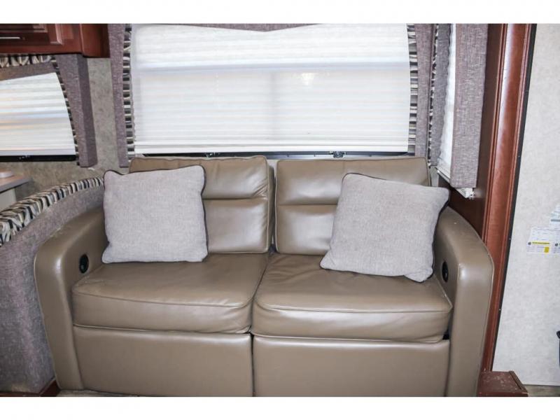 You will be wowed by the space and beauty inside the motor home. In the kitchen/living area there is a slide with a hide-a-bed sofa, dinette, and overhead cabinet. On the opposite side of the motor home you will see a double kitchen sink, overhead TV, three burner range, microwave, refrigerator or you can choose an optional residential refrigerator, and pantry.