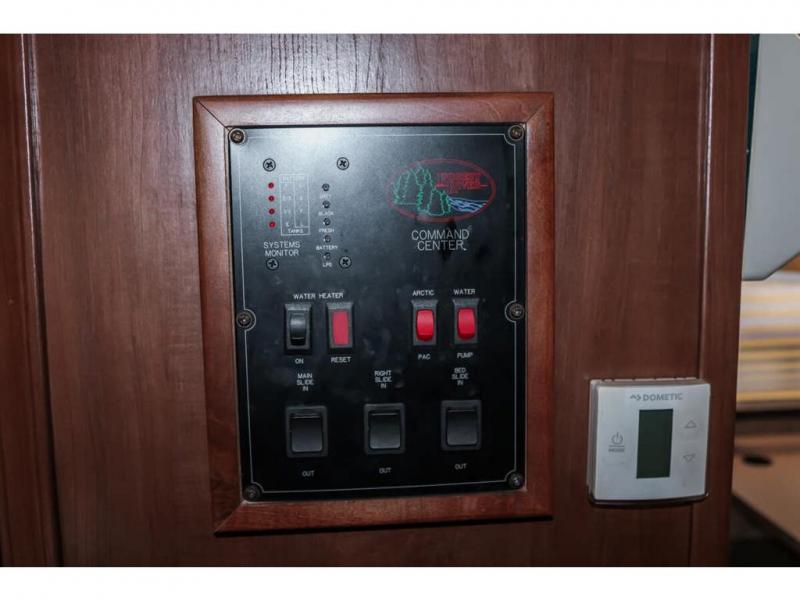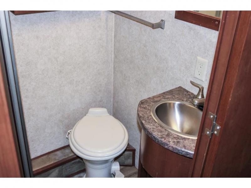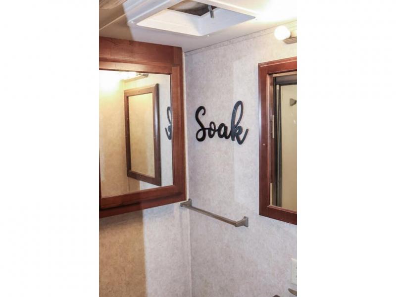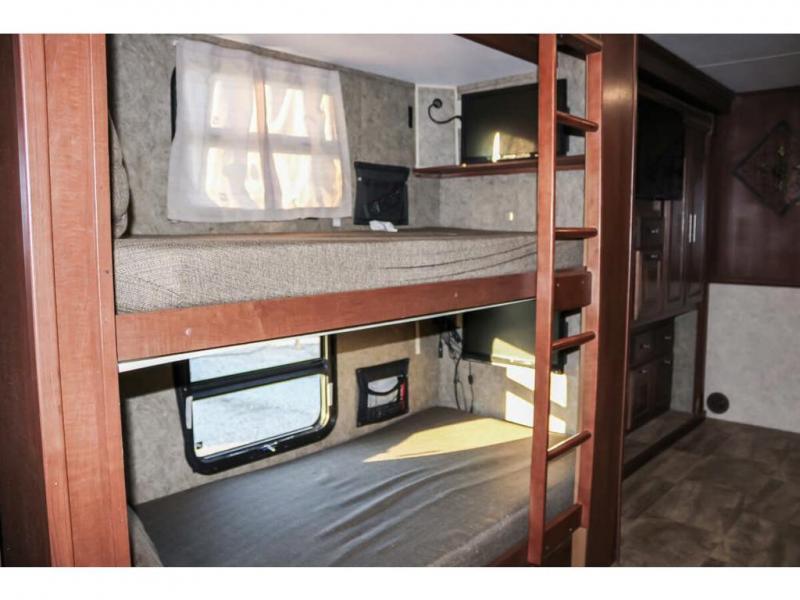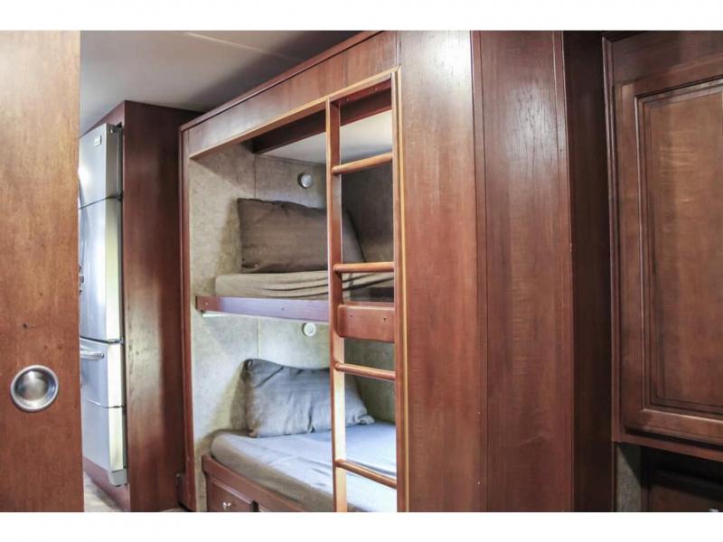 Across from the bathroom and leading in the bedroom there is a slide with a set of bunk beds, large wardrobe, and TV. Across from the wardrobe you will find a slide with a king bed. Along the rear of the room there is a master bath with a shower, toilet, sink, washer/dryer, and more!