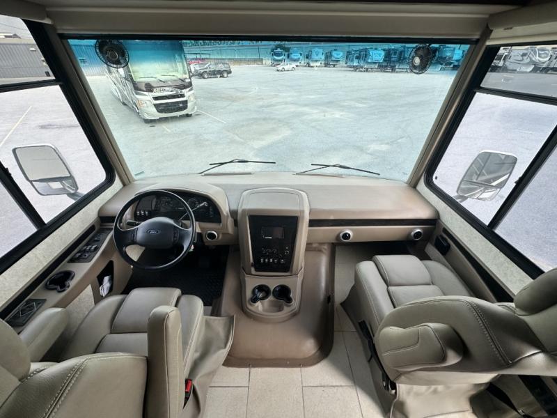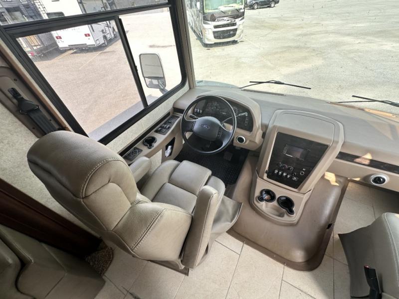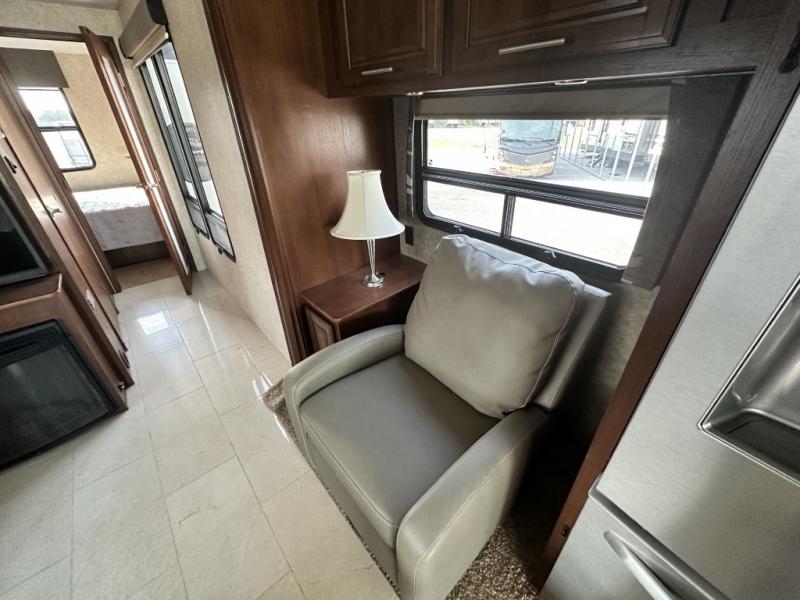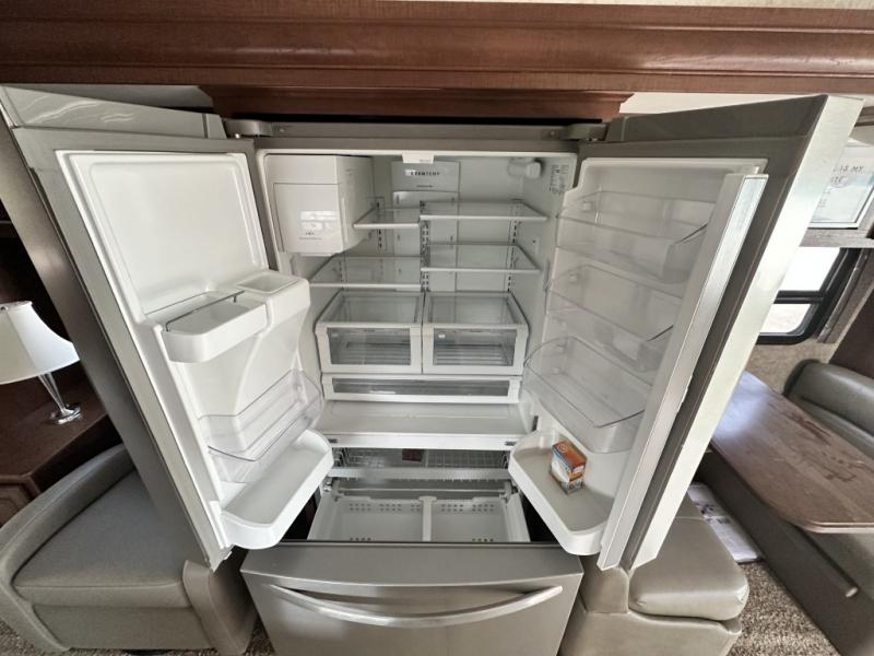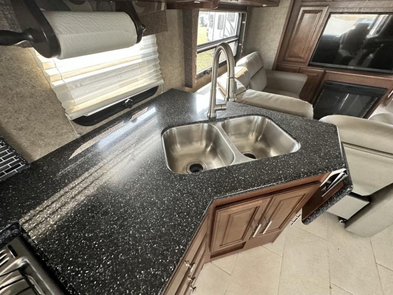 When you step inside the Georgetown XL 377TS motor home by Forest River you will immediately notice the openness of this floor plan. As you enter on the left, there is a three burner range, double kitchen sink, and l-sofa slide. Adjacent to the sofa there is a TV and fireplace. The opposite side of the motor home has a dinette, refrigerator, lounge chair slide. You can choose an optional free-standing table and chairs in place of the dinette.