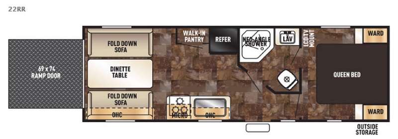 The kitchen area has a three burner range, a microwave oven, and large sink along the curb side of the unit. Across from the sink there is a walk-in pantry for your dry and canned food items, plus a refrigerator.