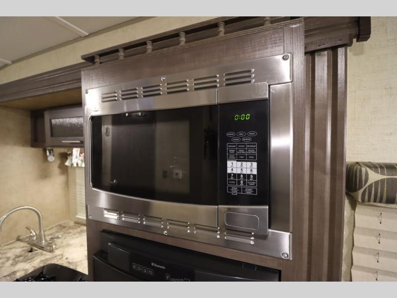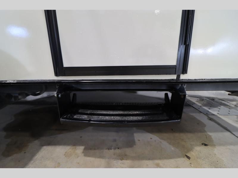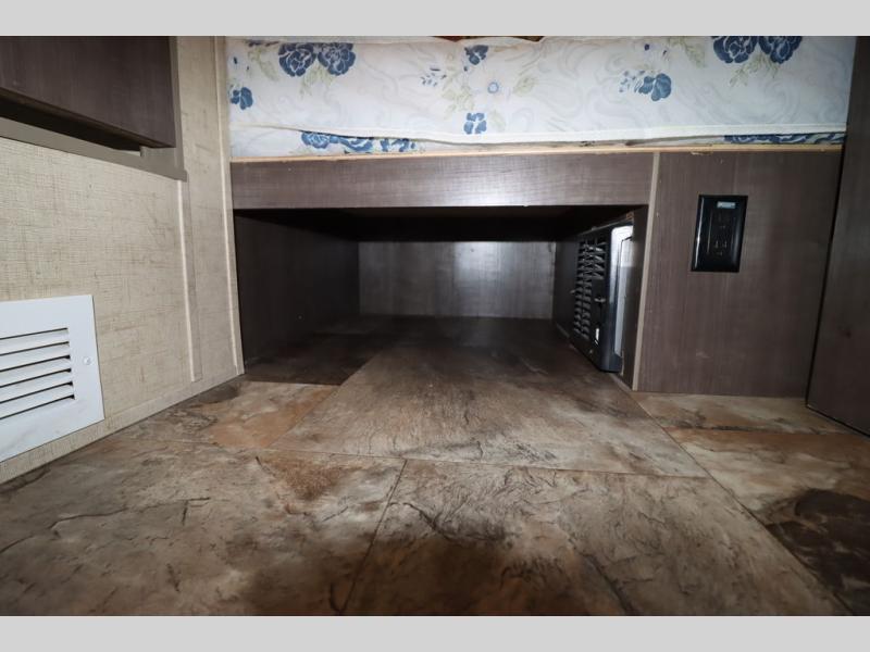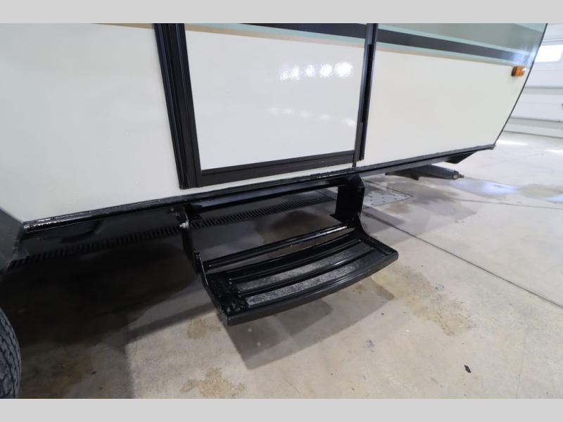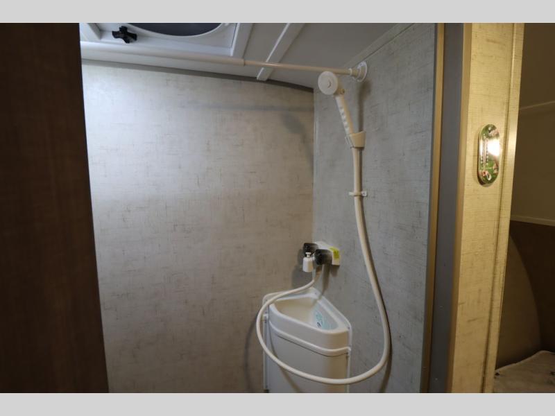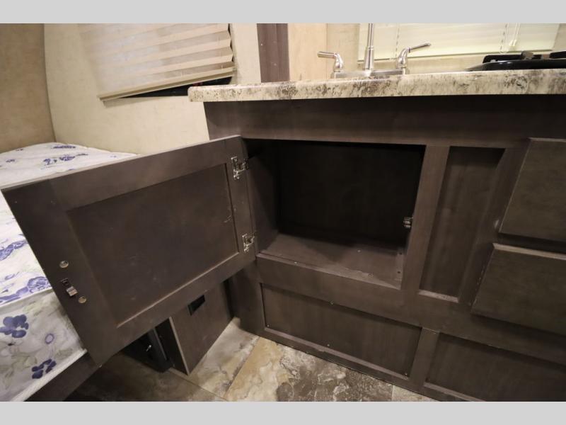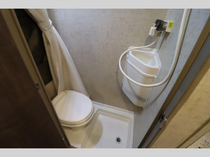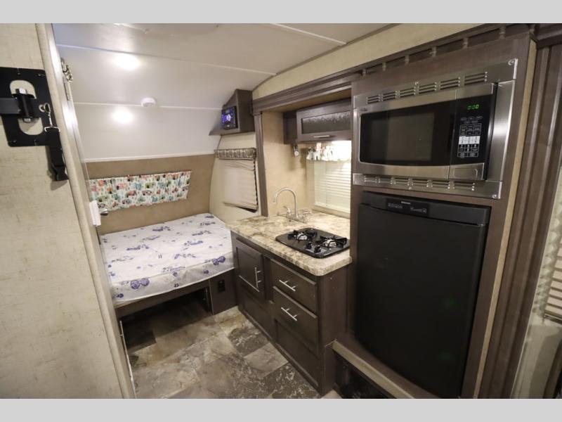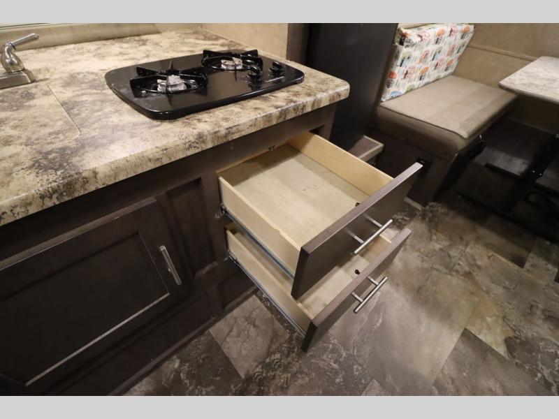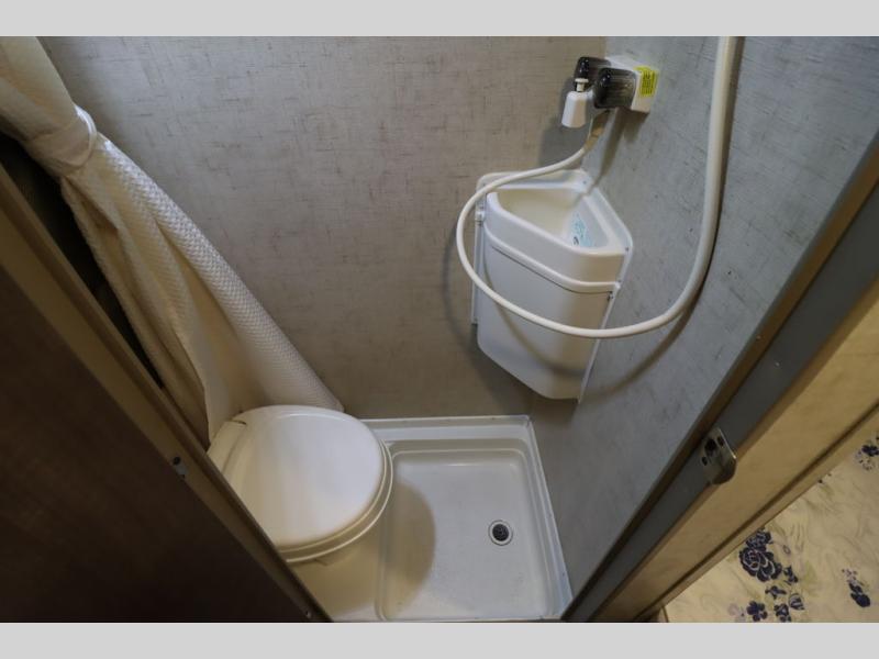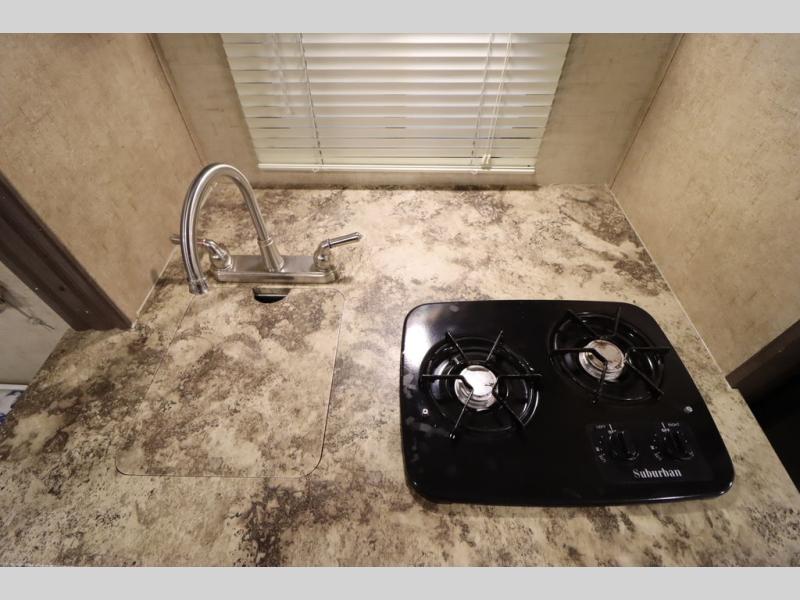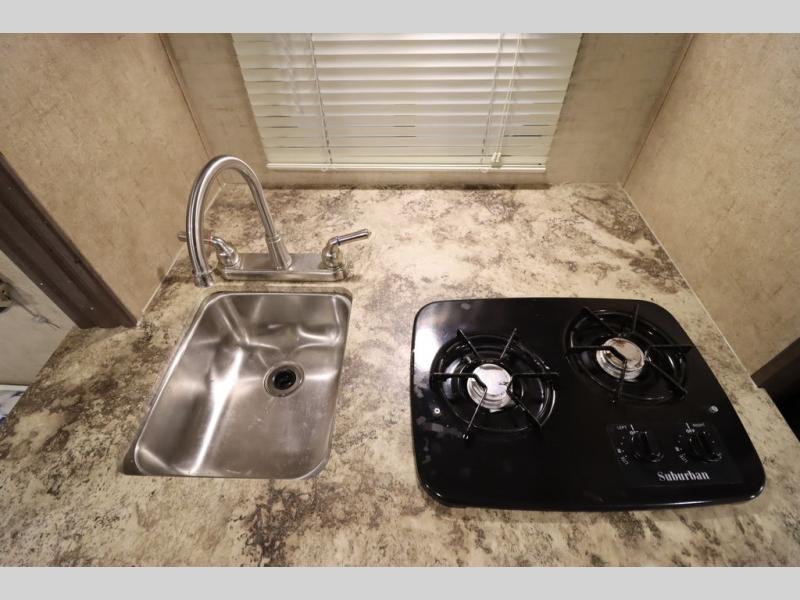 The slide has a single sink, two burner range, and refrigerator. On the opposite side of the trailer there is a bath with a toilet and shower.