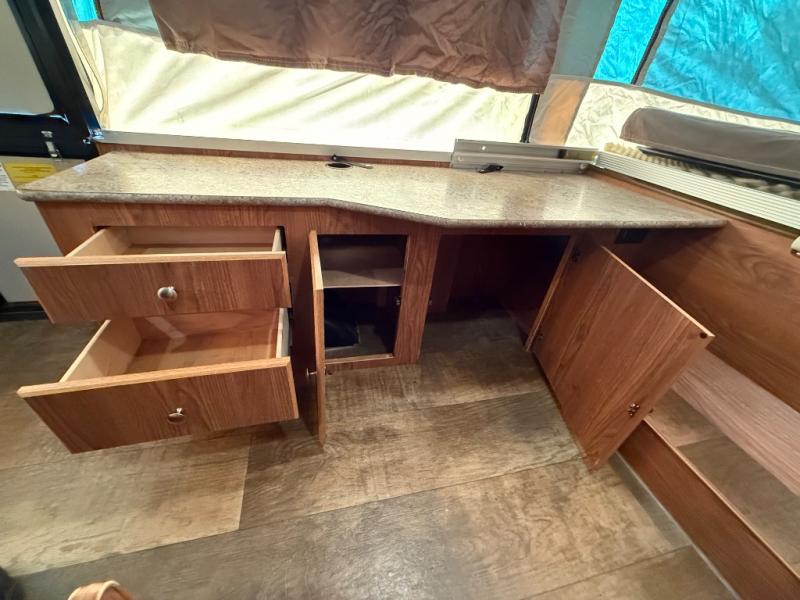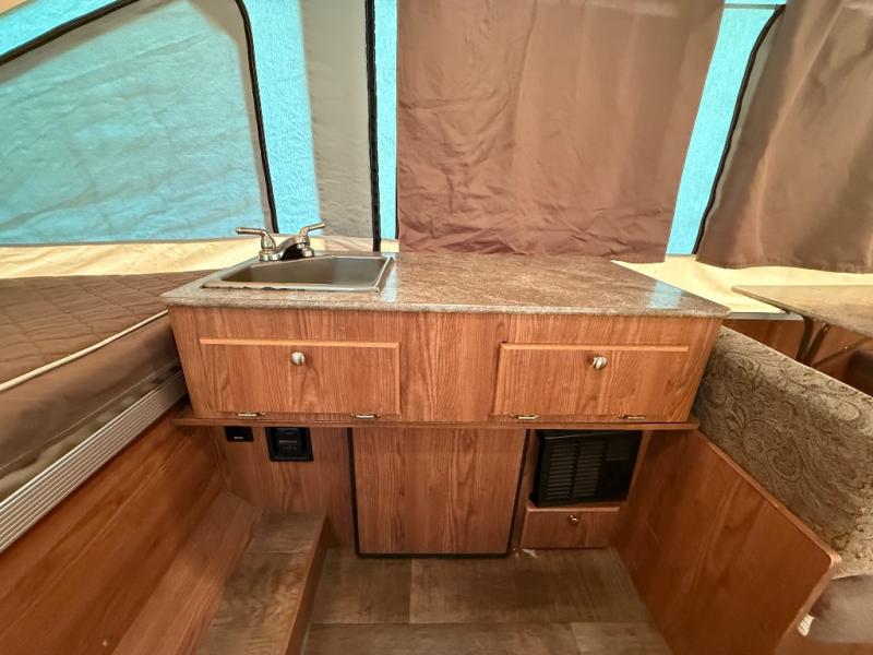 As you enter this folding pop-up camper, there is a cabinet in the front right corner. Across, there is a booth dinette and a single bowl sink along the far wall. An optional refrigerator could be included here.