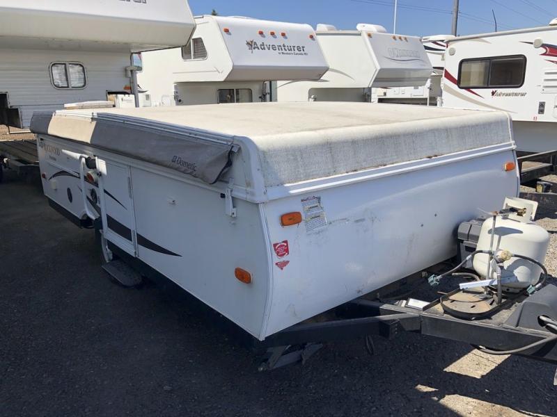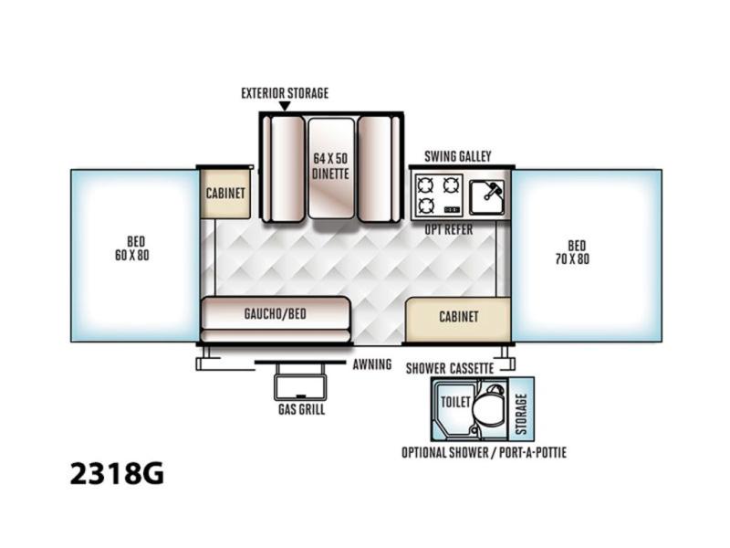 The front king and rear queen tent end beds offer comfortable sleeping. Inside you will find a gaucho/bed to the left. Across, the back wall holds a cabinet in the rear corner and a swing level galley with three burner stove top, single bowl sink, and optional refrigerator in the front corner. The center of the back wall features a slide out with a 64 x 50 booth dinette.