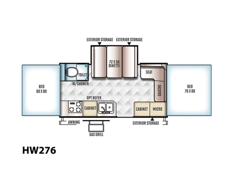 The Rockwood High Wall Series HW276 is a folding pop-up camper from Forest River. It includes a rear queen and a front king tent end bed.
