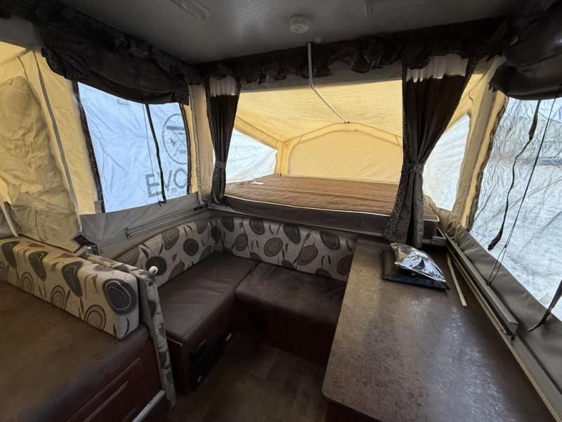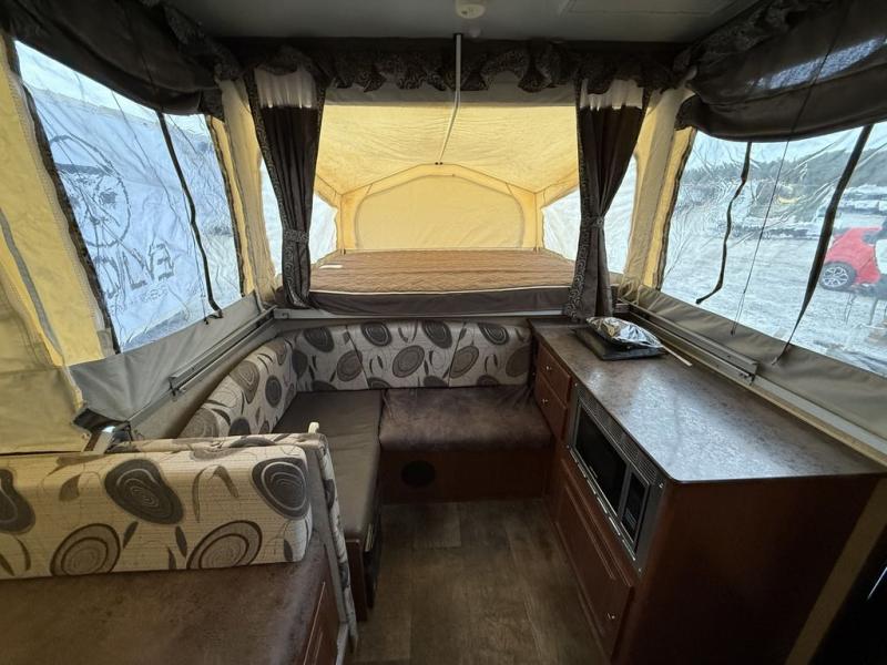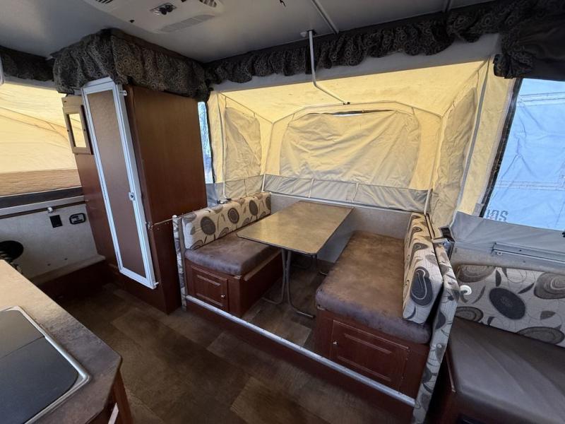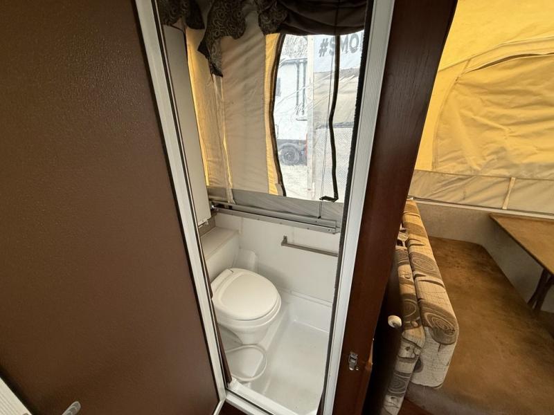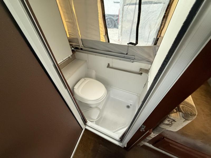 Inside this pop-up camper, there is a hard wall shower and toilet. A slide out holds a 72" x 50" dinette, allowing extra room to maneuver around inside.