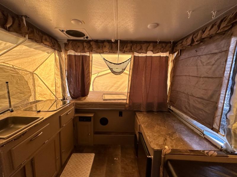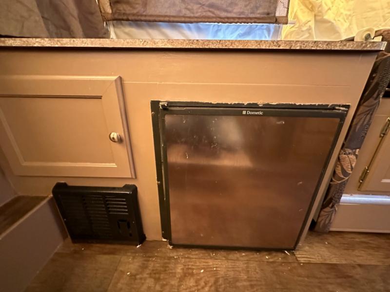 As you continue around, a slide out has a booth dinette. Back inside the pop-up camper is a cabinet with an optional refrigerator below.