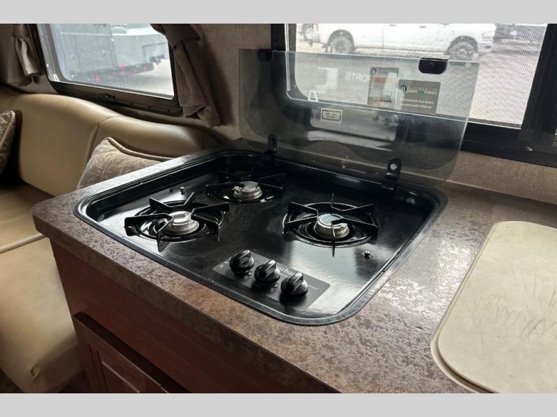 Across from the dinette there is a sofa, three burner range, double kitchen sink, overhead cabinets, and microwave complete the interior.