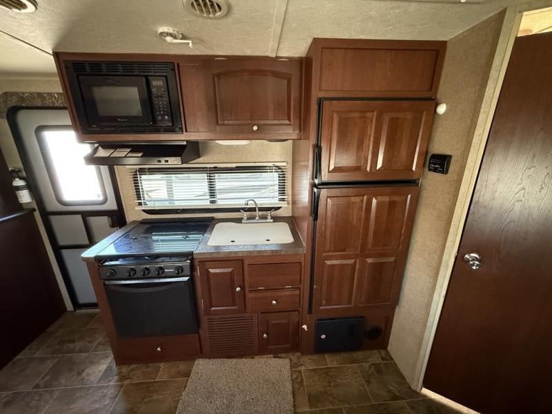 An entertainment center is immediately to your right as you enter near the front. To the left you will find a three burner range, double kitchen, overhead cabinets, and a refrigerator.