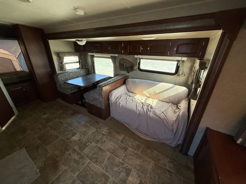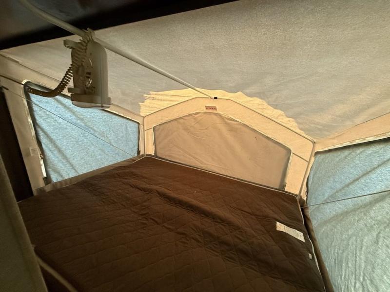 Front and rear queen tent end beds feature a shelf above the openings for extra storage. The slide out has a booth dinette and sofa with overhead storage cabinets running the full length of the slide. Or you can choose the Free Standing Option which includes a free standing table with chairs, and a 60" sofa, theater seating, or hide-a-bed.