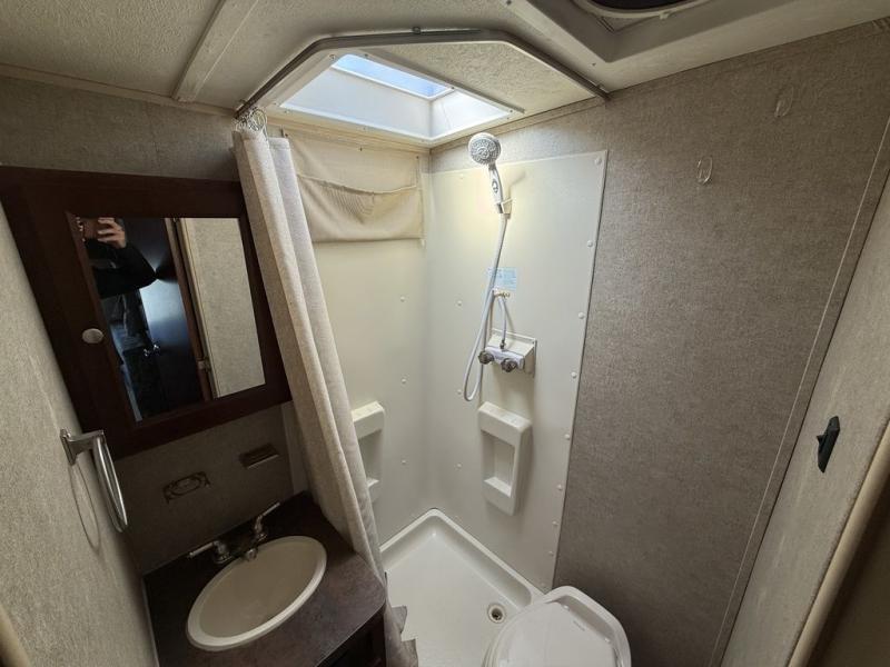 The back corner features a bathroom with toilet, linen storage, corner shower, vanity sink and medicine cabinet. There is a wardrobe across from the bath.