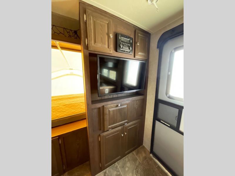 An entertainment center is immediately to your right as you enter near the front. To the left you will find a three burner range, double kitchen, overhead cabinets, and a refrigerator.