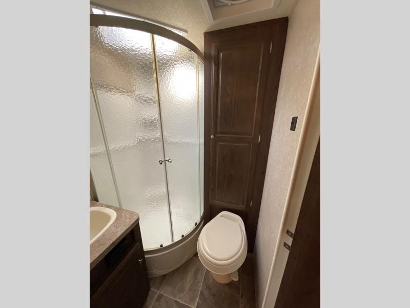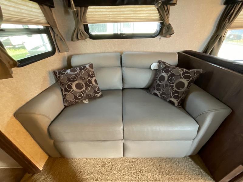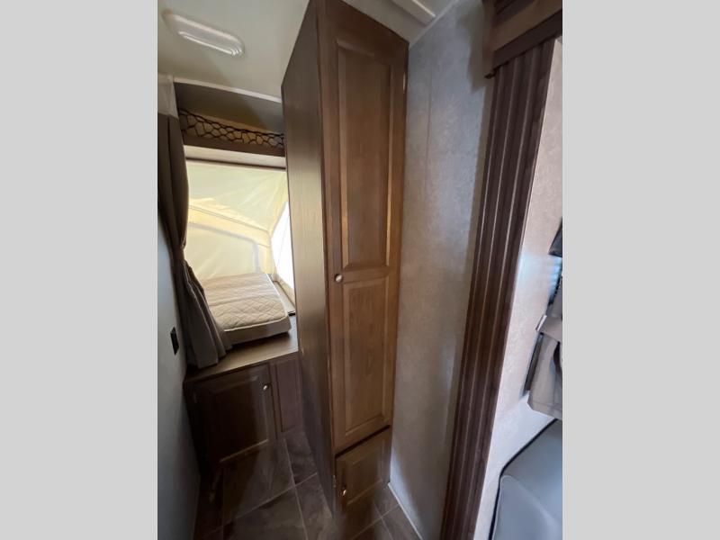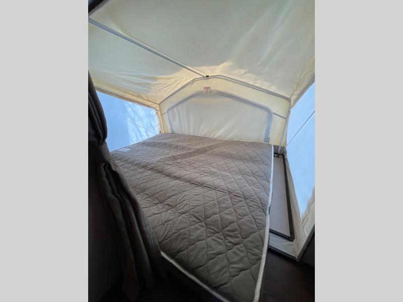 Front and rear queen tent end beds feature a shelf above the openings for extra storage. The slide out has a booth dinette and sofa with overhead storage cabinets running the full length of the slide. Or you can choose the Free Standing Option which includes a free standing table with chairs, and a 60" sofa, theater seating, or hide-a-bed.