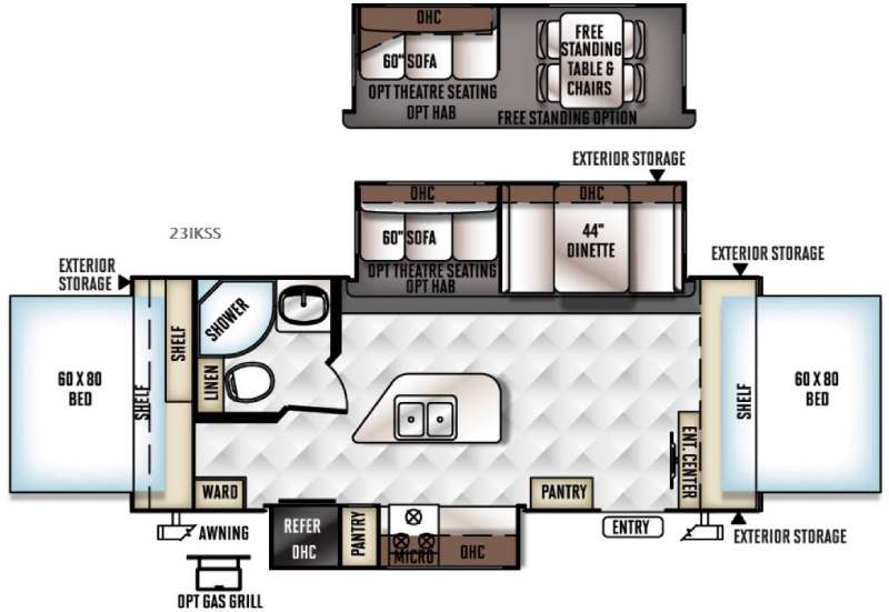 Outside exterior storage is found on three sides as well as an awning along the curb side. You may also choose an optional gas grill.