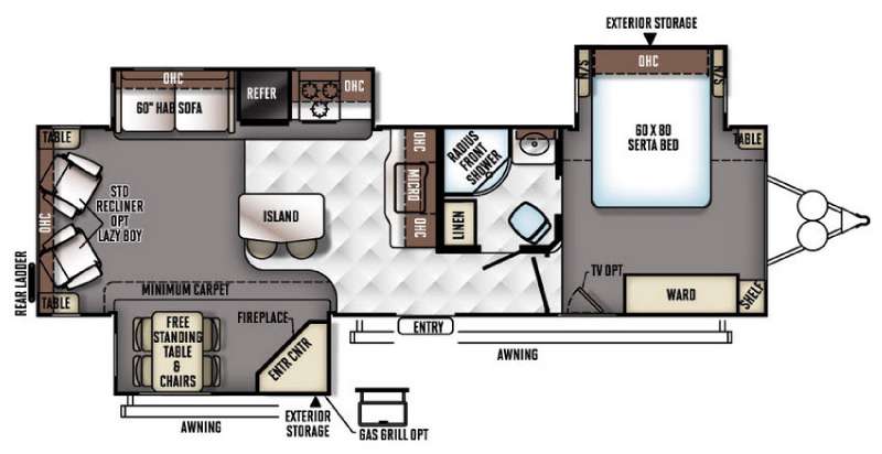 There are plenty of overhead cabinets throughout the inside of the travel trailer, as well as exterior storage. Outside find two awnings, exterior storage, an optional gas grill, plus more!
