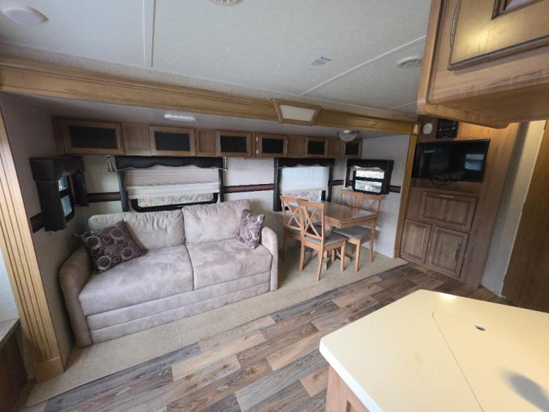 As you enter close to the the rear, there are two lounge chairs including two end tables. On the road side, the slide includes a hide-a-bed sofa and a dinette, or choose an optional free-standing table with chairs, and sofa or theater seating. Next to the slide you will find an entertainment center and TV on the interior wall. The opposite side of the trailer has an optional counter top extension, angled double kitchen sink, three burner range, microwave, and a refrigerator.