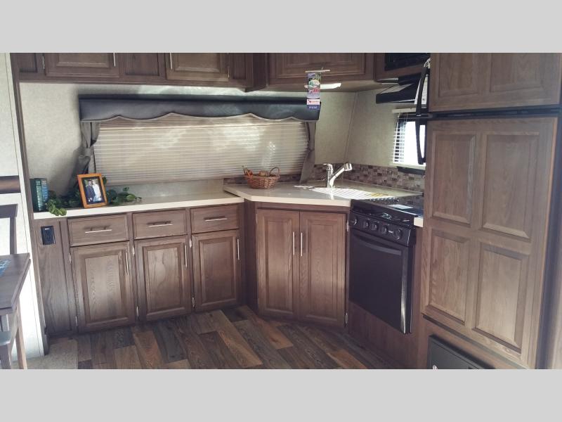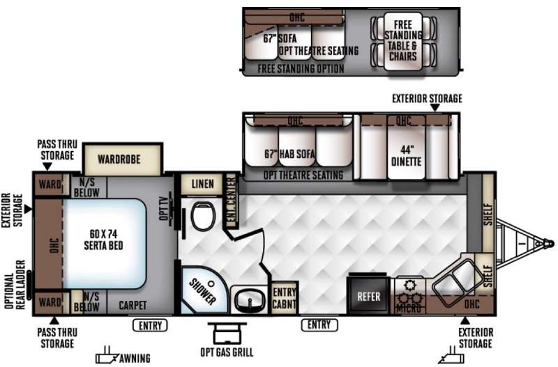 With all of the overhead cabinets throughout the trailer and the exterior storage compartments on the sides as well as the rear of the trailer, bringing all of the necessary items from home isn't a problem. You can even enjoy an optional gas grill outside, optional exterior rear ladder, optional theater seating inside, plus much much more!