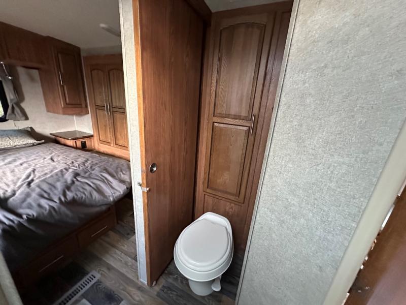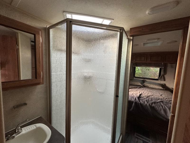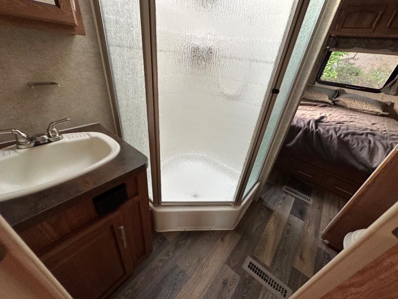 The walk-thru bathroom offers a toilet and linen cabinet on one side of the trailer, plus a sink and corner shower on the other side.