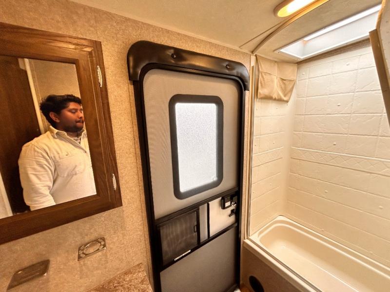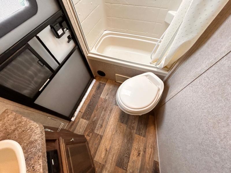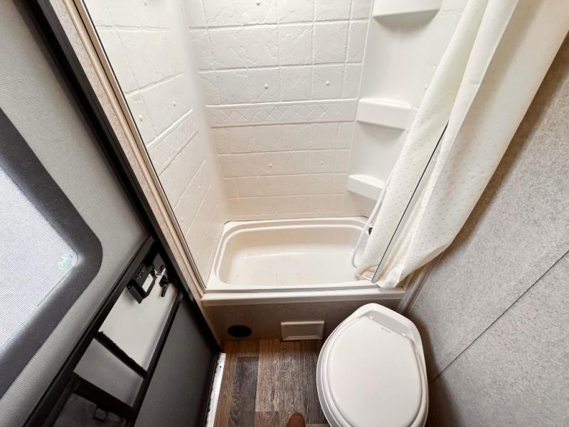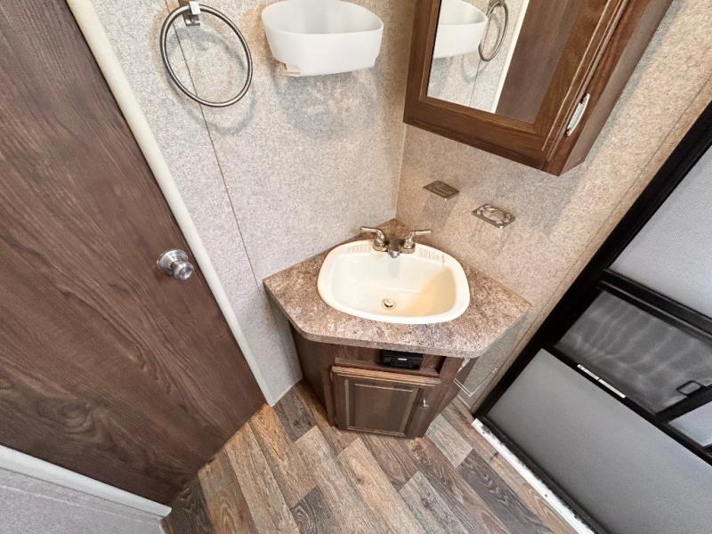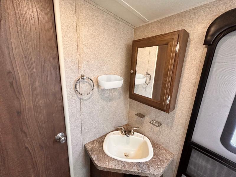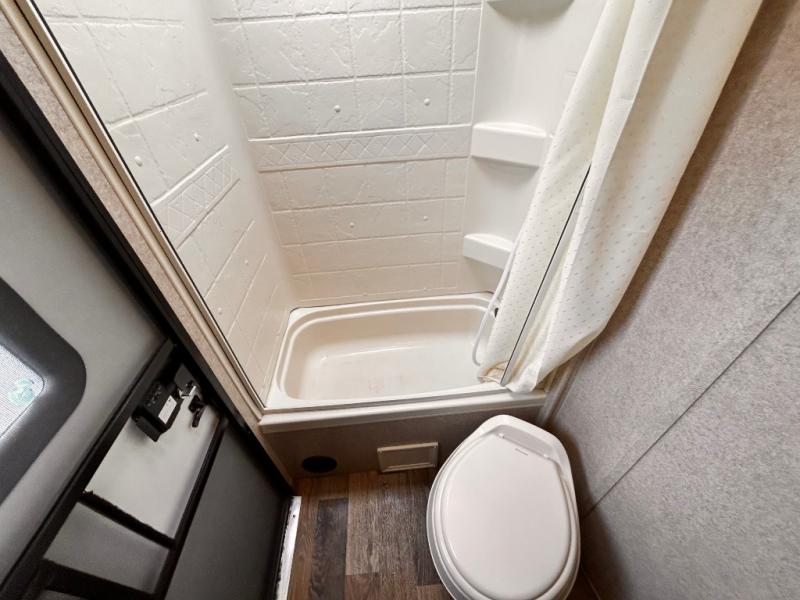 In the rear bathroom you will find an angled sink, medicine cabinet, toilet, and a tub. The second entry/exit door to the trailer allows you access to the outside from the bath.