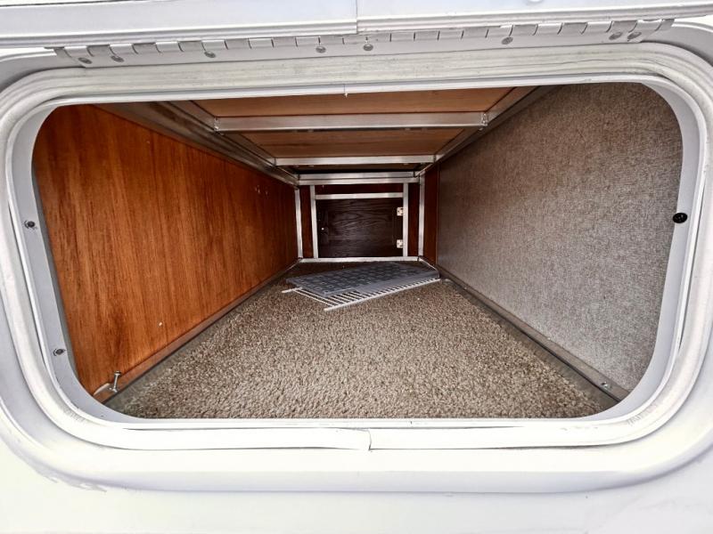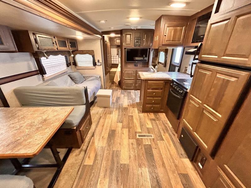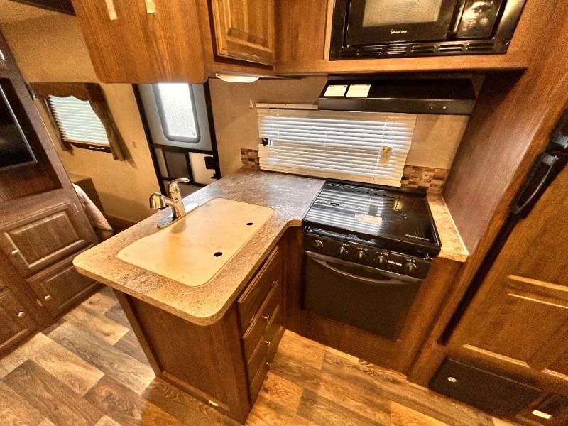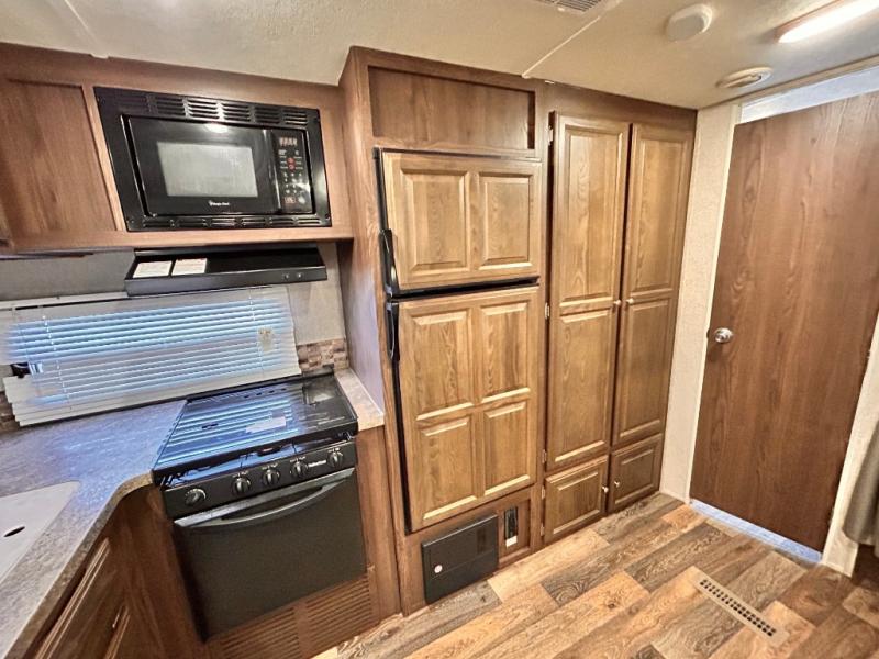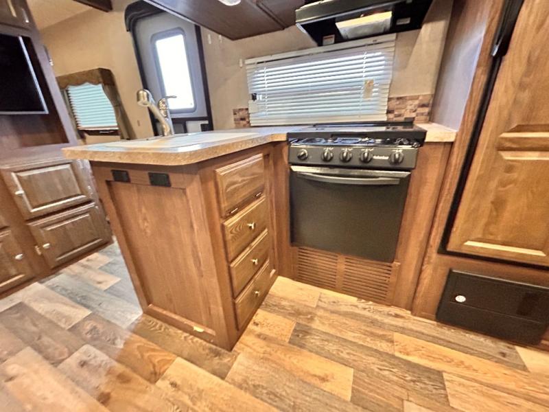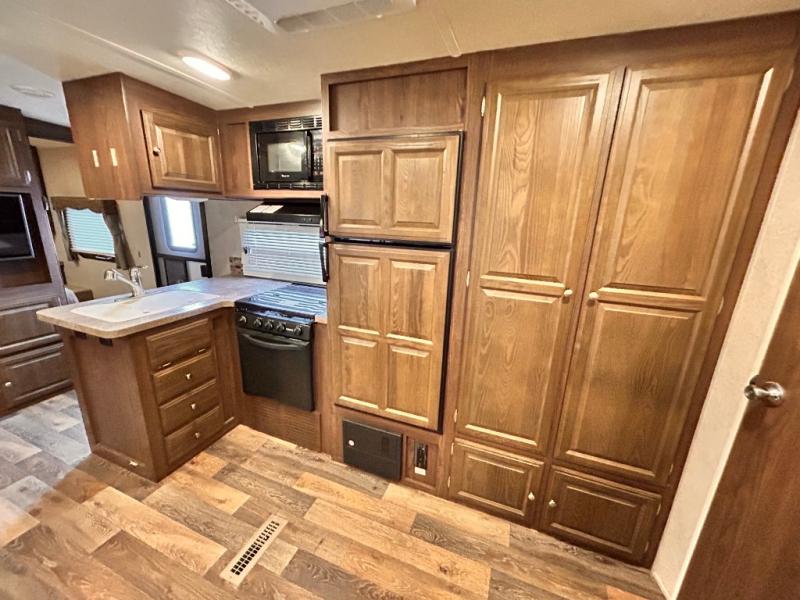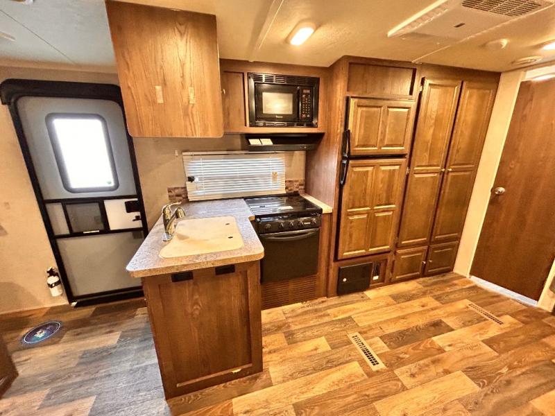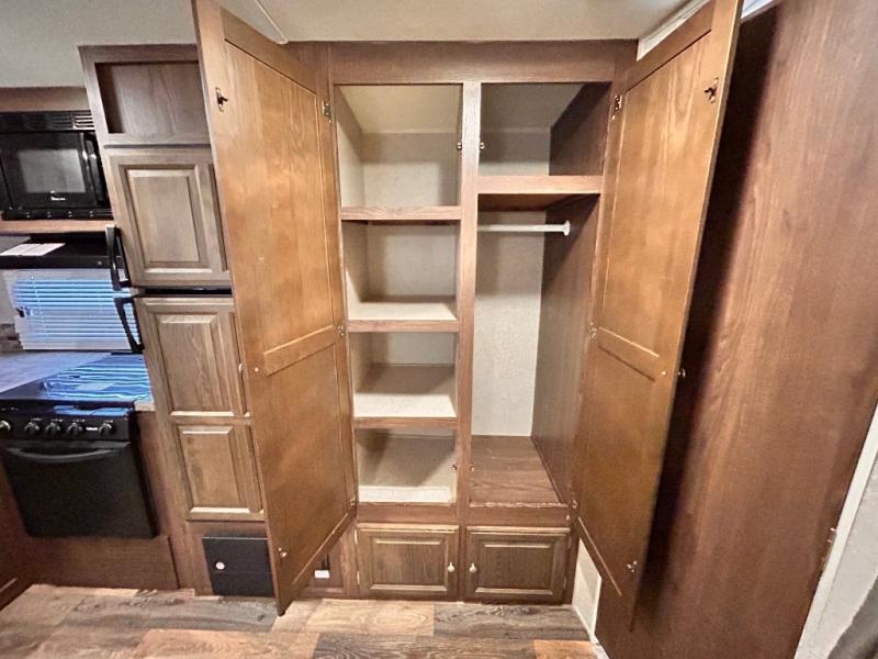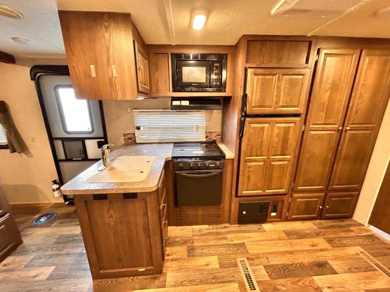 The main living area has a slide out with a sofa and a 44" dinette, or you can choose an optional free standing table with chairs. On the opposite side of the trailer you will find a l-shaped countertop with an optional counter top extension, double kitchen sink, three burner range, microwave, refrigerator, and two pantries for your non-perishables.