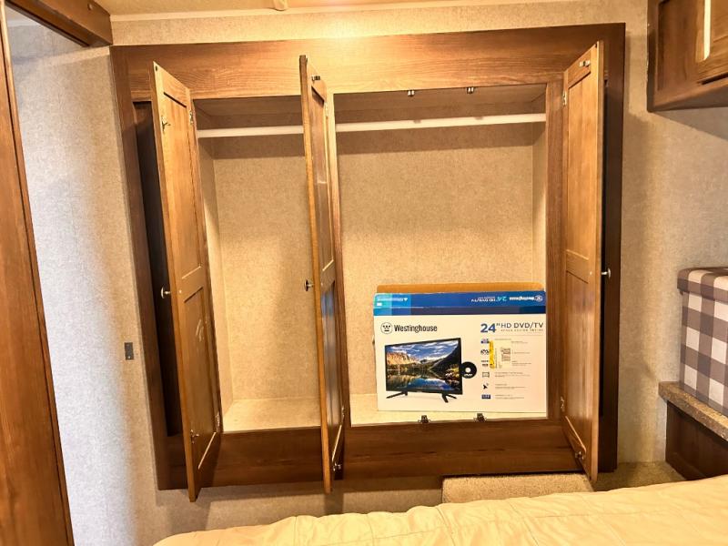 As you enter the main entrance, there is a bedroom to the right. The bedroom has a 60" x 74" bed with nightstands on either side of the bed and a wardrobe. Along the road side of the room you will find a wardrobe slide for additional storage space. At the foot of the bed there is an optional TV.